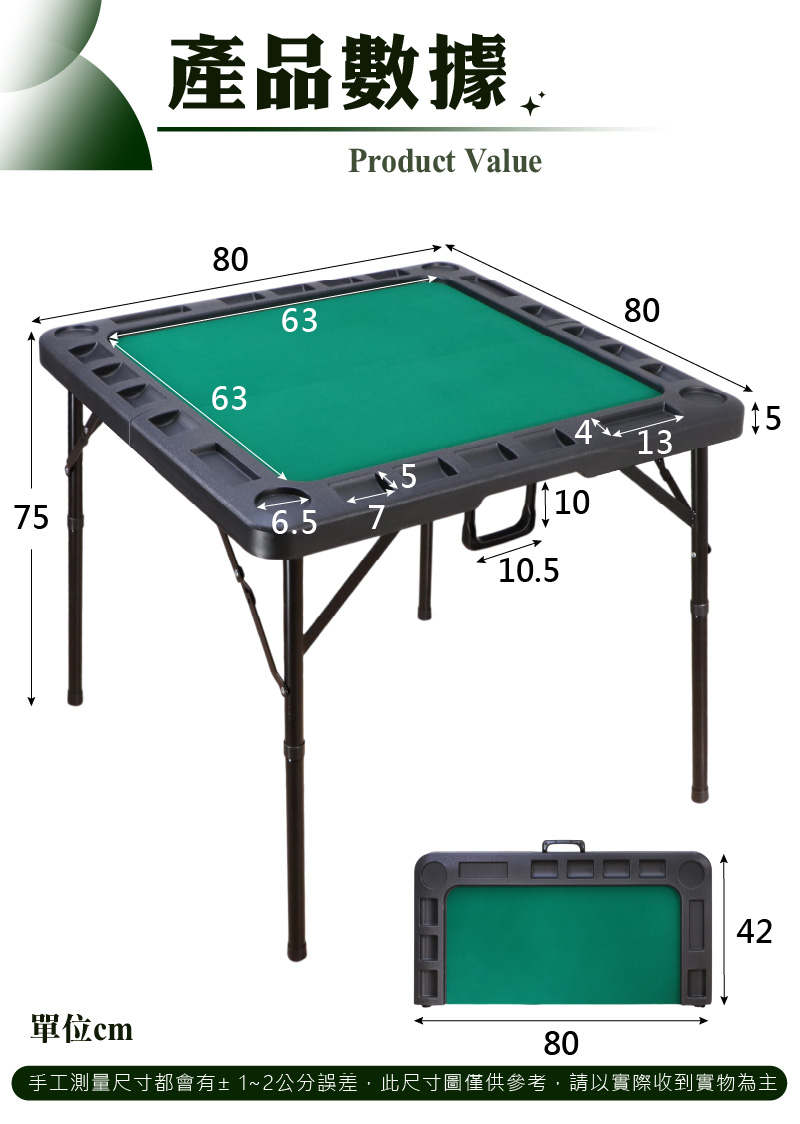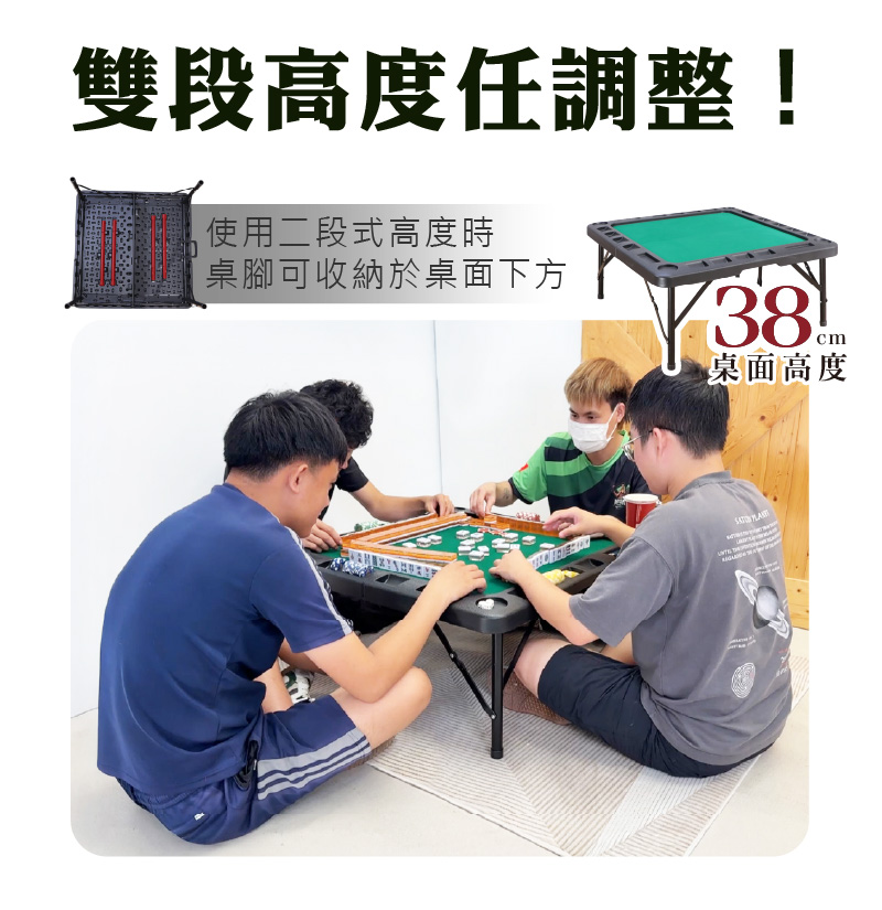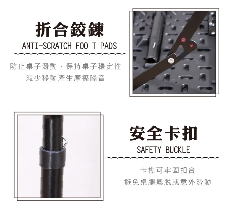 四邊桌腳附設三角穩固支撐鉸鍊,安全卡榫確保桌子穩固性。