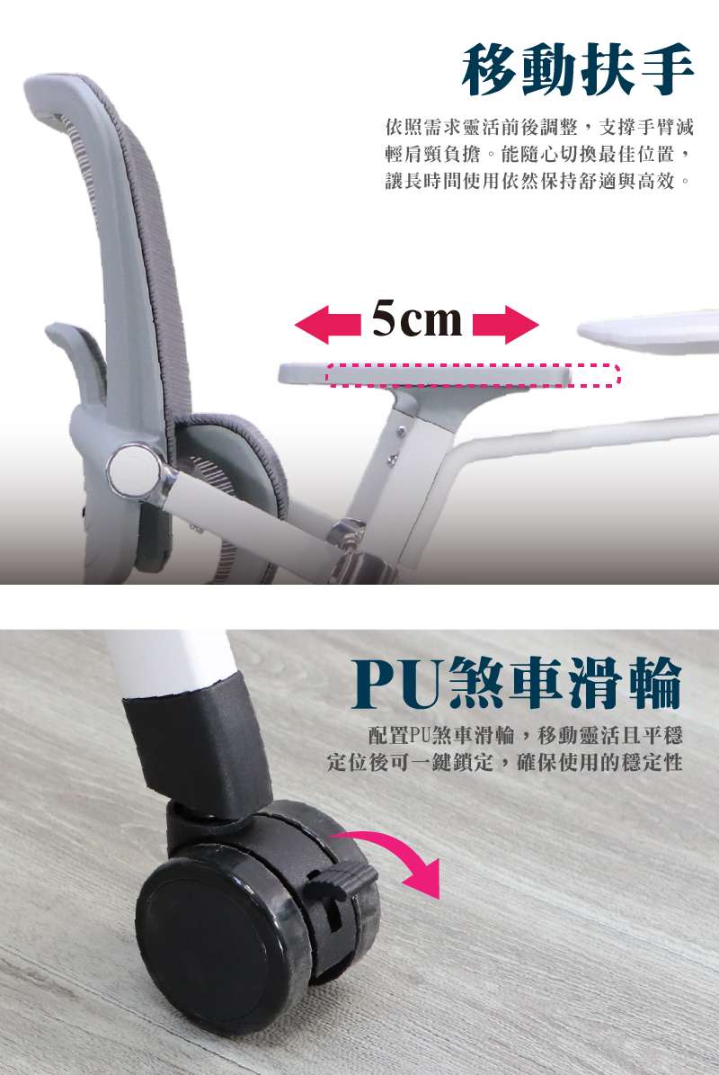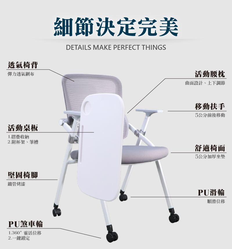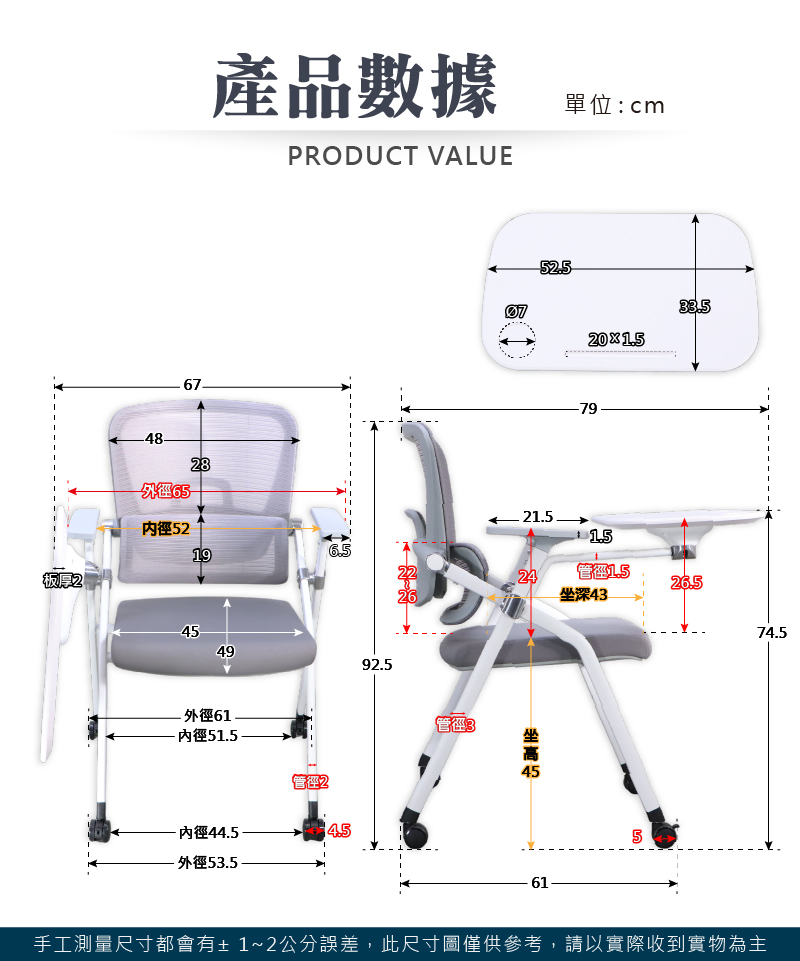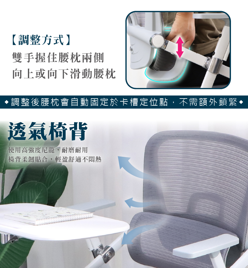 【產品規格】 ●內容物:椅子1入 ●產品顏色:黑、灰(兩色可選) ●產品材質: 扶手材質:PP 桌板材質:PP 椅背材質:彈力透氣網布 腰枕材質:彈力透氣網布 坐墊材質:針織布、高密度泡棉 支架材質:鐵管烤漆 輪子材質:PU煞車輪 ●承重:100kg ●產品尺寸: 桌面收納:67 x 75 x 92.5 cm 桌面展開:67 x 79 x 92..5 cm 扶手外寬65cm、扶手內寬52cm、扶手到坐墊24cm 扶手長度21.5cm、扶手寬度6.5cm 椅背高度47cm、椅背寬度48cm 腰枕高度19cm、腰枕寬度42cm 整體高度92.5cm 坐高45cm、坐寬45cm、坐深43cm ●箱子尺寸:108 x 32 x 70cm ●產品+箱子重量:14 kg ●產品重量:12 kg ●箱子重量:2 kg ●組裝:此為【簡易組裝】商品 ●保養方法:乾布擦拭乾淨後即可