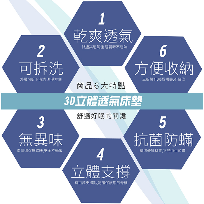★台灣製造,品質保證★3D立體結構設計,良好支撐透氣更舒適★5cm最剛好的厚度★三折疊設計,方便收納★可拆洗,抑菌潔淨好安心