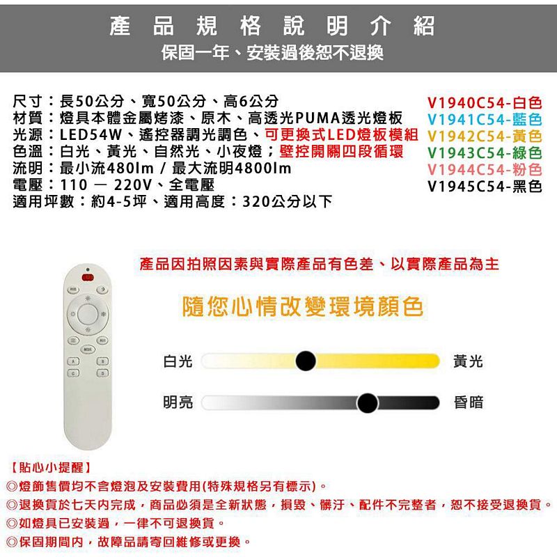 尺寸:長50公分、寬50公分、高6公分 材質:燈具本體金屬烤漆、原木、高透光PUMA透光燈板 光源:LED54W、遙控器調光調色、可更換式LED燈板模組 色溫:白光、黃光、自然光、小夜燈;壁控開關四段循環 流明:最小流480lm / 最大流明4800lm 電壓:110 – 220V、全電壓 適用坪數:約4-5坪、適用高度:320公分以下