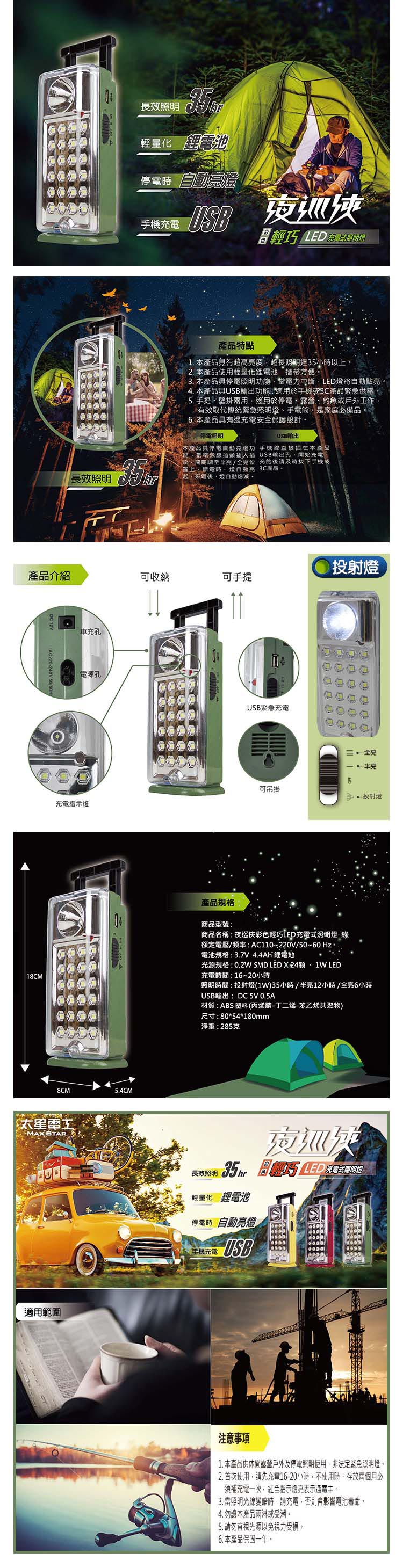 ◆商品特色1.具有超高亮度,超長照明達35小時。2.使用輕量化鋰電池,攜帶方便。3.具有停電照明功能,當電力中斷,LED燈將自動點亮。4.具USB輸出功能,適用於手機或3C商品緊急供電。5.手提、壁掛兩用,有效取代傳統緊急照明燈、手電筒,是家庭必備品。6.具有過充電安全保護設計。7.適用場所:戶外、露營、釣魚、停電、汽修、保全、地震、火災…等。 ◆商品規格與尺寸商品尺寸:(高)18x(寬)8x(深)5.4/公分包裝尺寸:(高)22.1x(寬)11.6x(深)8.4/公分商品重量:0.285kg包裝重量:0.402kg額定電壓/頻率:AC110V~220V/50~60Hz電池規格:3.7V 4.4Ah鋰電池光源規格:0.2W SMD LEDx24顆/1W LED充電時間:16~20小時照明時間:投射燈1W/35小時、半亮/12小時、全亮/6小時材質:ABS塑料(丙烯-丁二烯- 苯乙烯共聚物)生產地:中國◆注意事項1.本產品供休閒露營戶外及停電照明使用,非法定緊急照明燈。2.首次使用,請先充電16~20小時,不使用時,存放兩個月必須補充電一次, 紅色指示燈亮表示通電中。3.當照明光線變暗時,請充電,否則會影響電池壽命。4.勿讓本產品雨淋或受潮。5.請勿直視光源以免視力受損。6.本產品保固一年。◆警告1.請勿擅自拆解、修理或改造產品。2.請勿在水中及易燃易爆等場所使用。