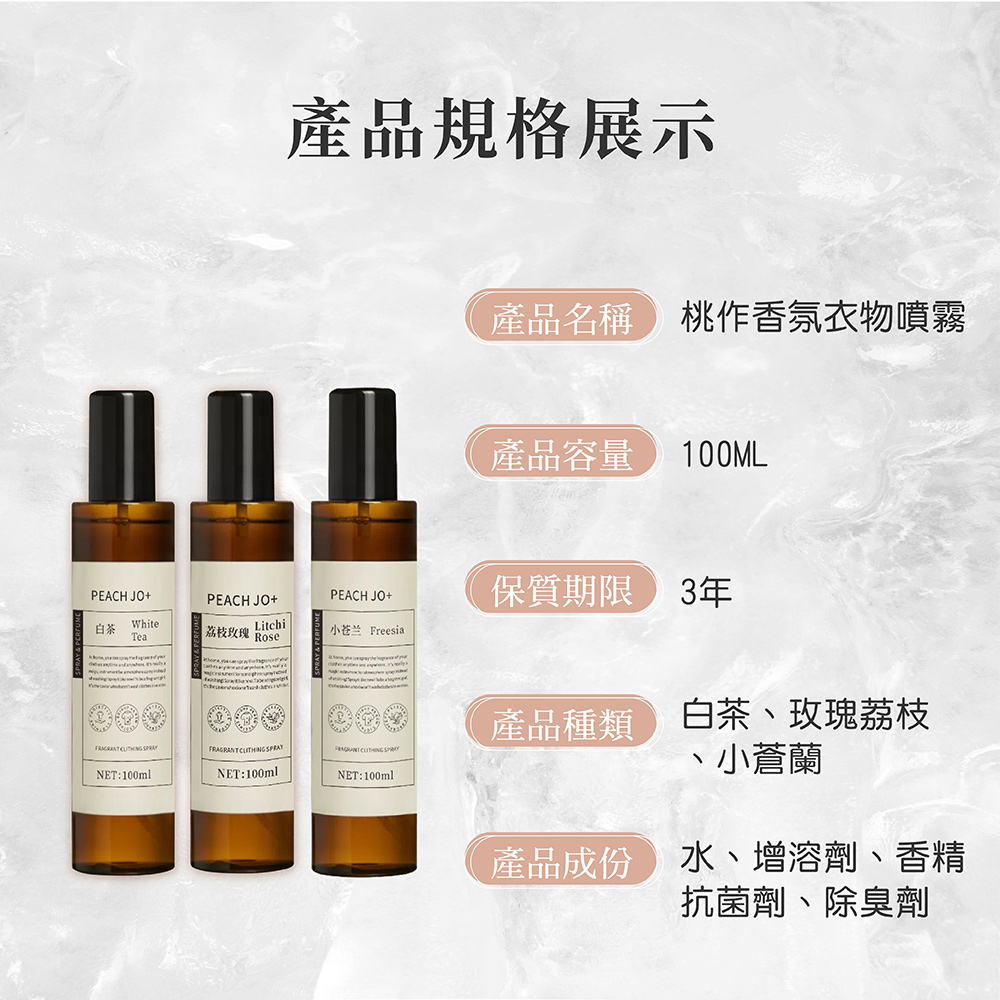 品名:桃作香氛衣物噴霧成分:水、增溶劑、香精、抗菌劑、除臭劑容量:100ml/瓶組合:3入組/6入組保存期限:三年製造日期:標示於包裝上產地:中國進口商:茂榕數位科技有限公司地址:桃園市平鎮區廣東路57巷1號電話:0800-666865【使用方法】距離衣物15cm處噴灑,香氣更均勻。【適用範圍】衣物淨味、居家芳香、浴廁除臭【保存方式】請置於室內陰涼乾燥處,避免陽光直射。【注意事項】※請避免直接接觸眼睛,若不慎誤入,請用大量清水沖洗,並立即送醫。※使用前請對於織物角落測試,降低形成色斑的機率。※請勿噴灑在淺色紡織品、皮革、牆面等地方。※商品圖片為實物拍攝,由於螢幕顯示色差、拍攝光線等因素,照片與實物可能略有差異,請以實物為準。※商品尺寸為人工測量,標示僅供參考,難免與實際商品尺寸略有誤差,誤差尺寸±2cm為國際驗貨標準可接受範圍。【退換貨需知】※拆封商品時,為了保障雙方權益,開封時務必錄影留證。※鑑賞期為猶豫期,並非試用期。※提醒您!商品需要全新且包裝完整的情況下,才能辦理退貨退款。