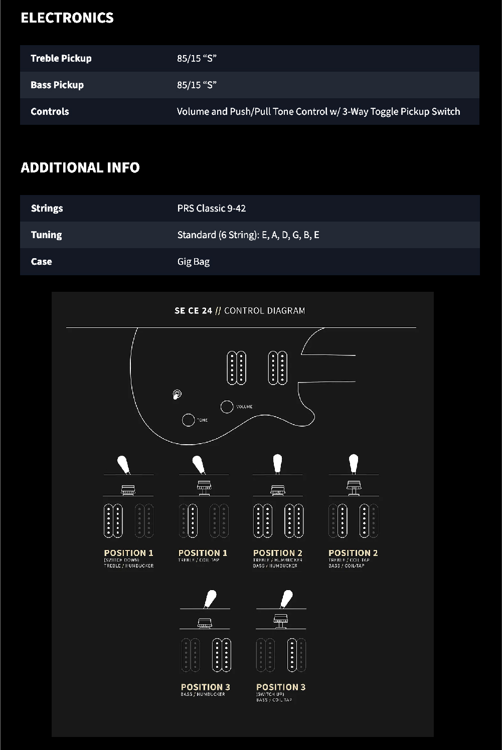 85/15 S 拾音器提供了具備清晰度與平衡感的寬廣高低頻表現,而推拉式音色控制鈕則增加了單線圈切換的多功能性。PRS SE CE 24 展現出的音色、演奏手感以及經典 PRS 外觀,能讓各種風格的樂手盡情揮灑。