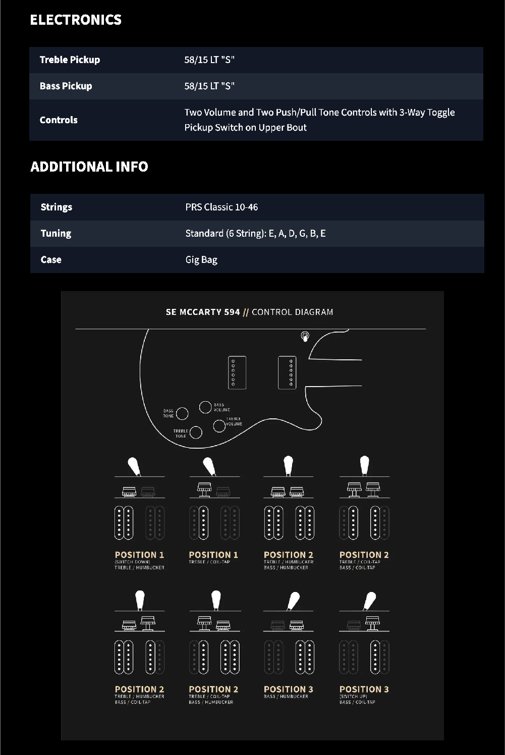 這款琴採用 24.594 英吋的弦長長度,這也是其型號名稱的由來。搭配稍微厚實的 Pattern Vintage 琴頸設計,不僅提供了舒適的握感,更增加了琴弦的張力與共鳴。PRS SE McCarty 594 是一款專為追求經典音色與穩定性能的樂手所設計的專業樂器。