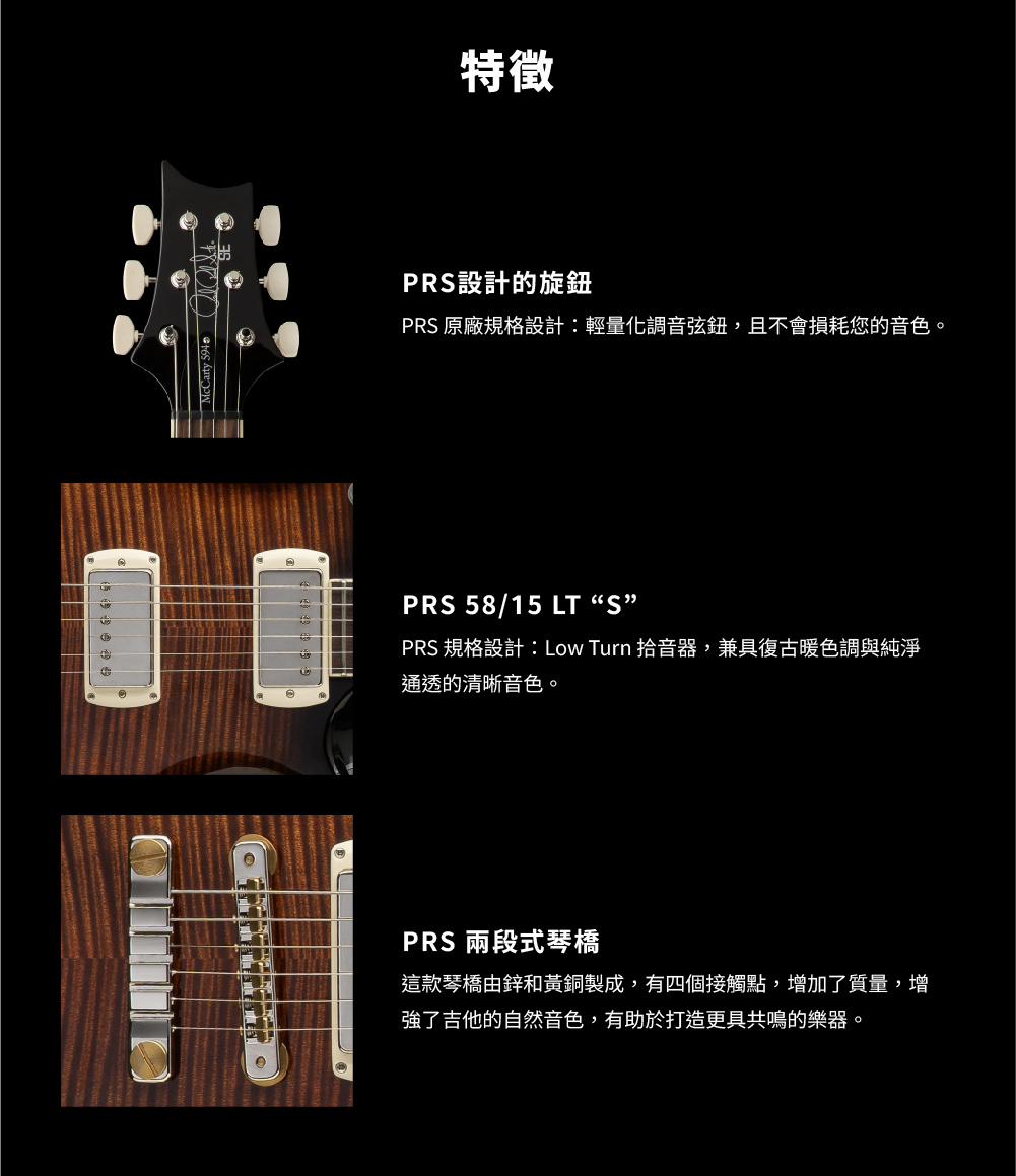 PRS SE McCarty 594 結合了復刻音色與現代製作工藝,是一款功能極其豐富的復古風格電吉他。透過鋅合金二件式琴橋與復古風格調音旋鈕,McCarty 594 忠實呈現了 McCarty 家族的核心特質。