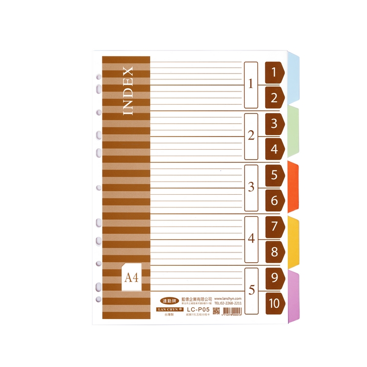 商品說明 ★編號:LC-P05 ★材質:紙質 ★規格:長297×寬223mm 適用於分隔五段式不同資料總類,顏色鮮明好辨識,可套用於多種孔夾內使用。 廠商代號:XF 責任代碼:5UX