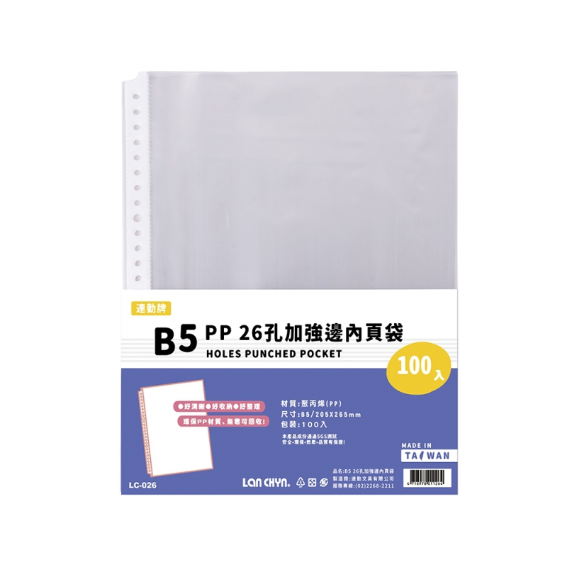 【連勤】P.P 26孔B5加強邊內頁袋 100張/包 LC-026