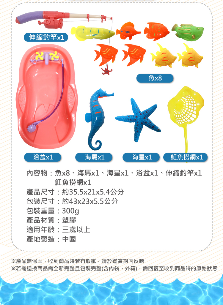 內容物:一袋=(魚x8、海馬x1、海星x1、浴盆x1、伸縮釣竿x1、魟魚撈網x1)13件裝入