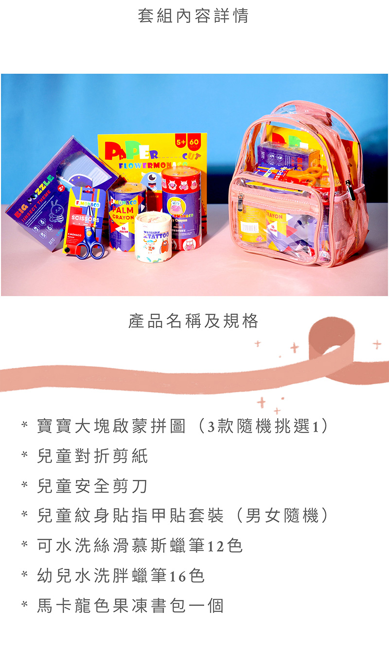 【正版授權 馬卡龍色透明果凍包美術套組】小巧可愛,繽紛馬卡龍色透明果凍包寶貝最好的美術禮物: 適合2-6歲寶寶內容豐富:剪紙、蠟筆、紋身貼一應俱全方便攜帶:外出逛街育兒好幫手超值組合套組,限時限量,售完為止組合內含:可水洗胖蠟筆16色 1個可水洗椎頭彩色筆12色 1個大塊啟蒙拼圖 動物/昆蟲/交通 三擇一(隨機出貨)兒童紋身貼 指甲貼套組 1桶兒童對折剪紙 1本安全剪刀 1把透明質感果凍包1個(包包可挑色)