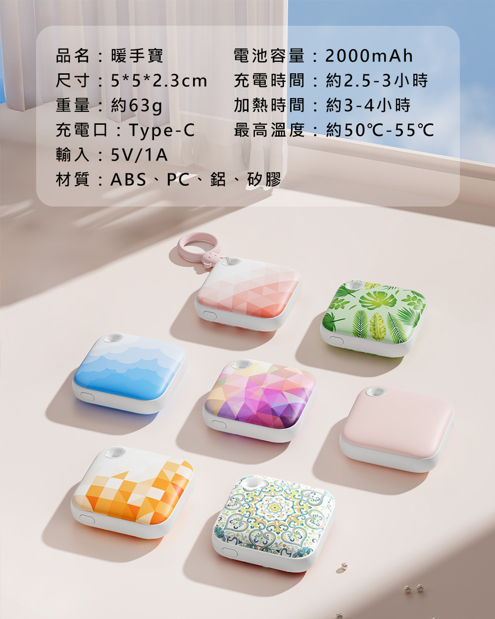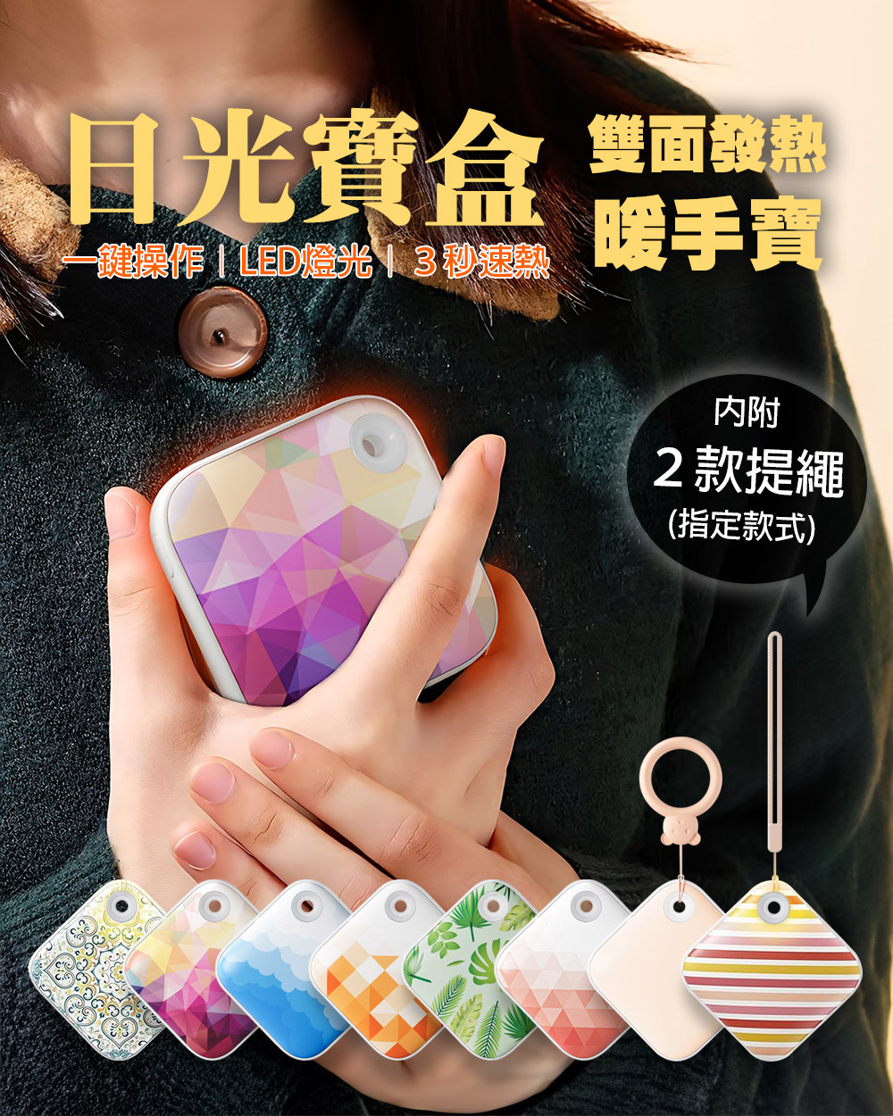 日光寶盒暖手寶【8色可選】附提繩 方塊暖手寶 暖手寶 雙面發熱 輕巧 LED燈 TYPE-C充電 小熊提繩 矽膠提繩 3秒發熱