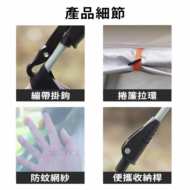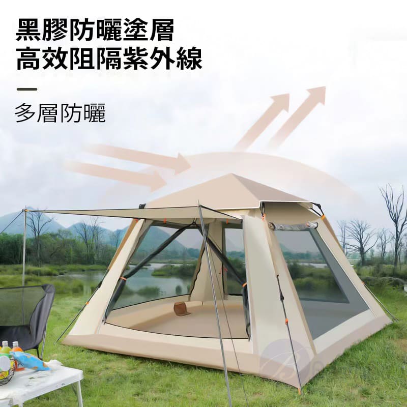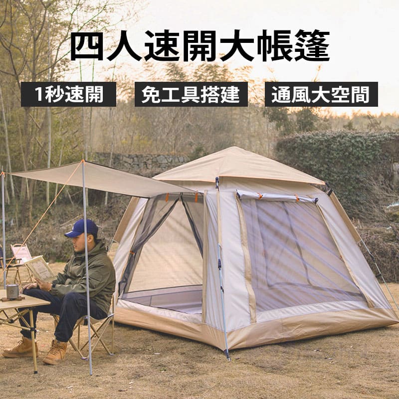 懶人速開帳,免工具搭建,輕鬆好開易收起; 速開「自動」支架,一拉一提不費力 有效阻隔紫外線,開心露營不被大太陽影響; 四面通風大紗窗,跟悶熱、蚊蟲說再見; 防水層大升級,接縫壓膠防雨超強悍; 貼心附贈收納袋及防潮墊,讓您露營更輕鬆