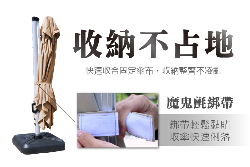 魔鬼氈綁帶輕鬆快速黏貼,快速收合固定傘布,整齊不凌亂。
