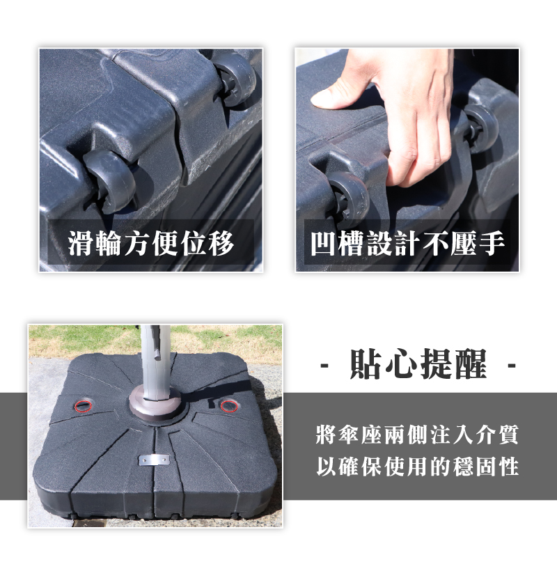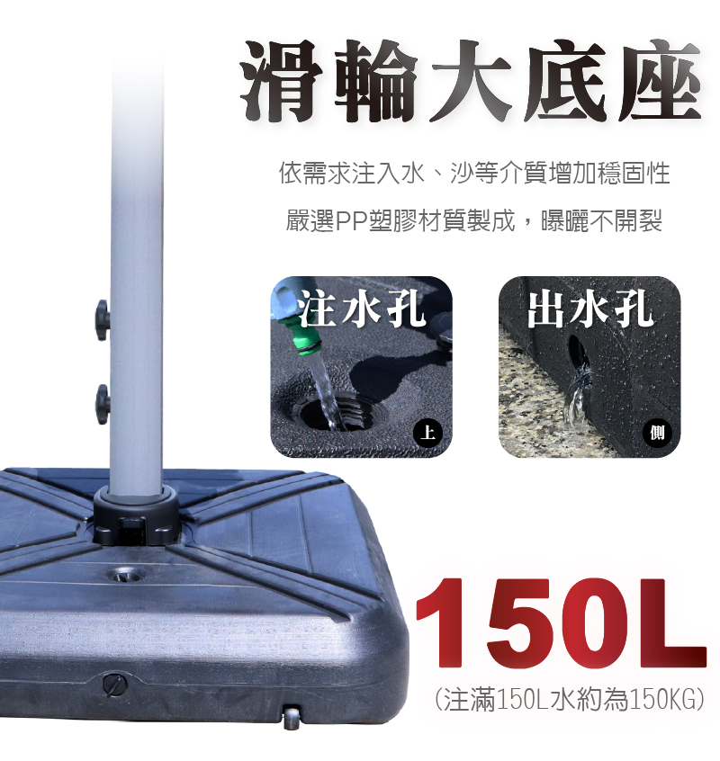 嚴選PP塑膠久曬不開裂,依需求注入150L的介質增加重量,下方增設滑輪方便位移。