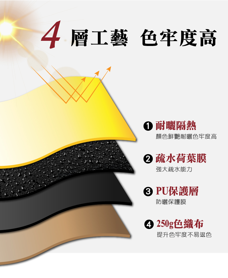 250G高磅數厚實傘布,牢色度6-7級,長保3年不退色。