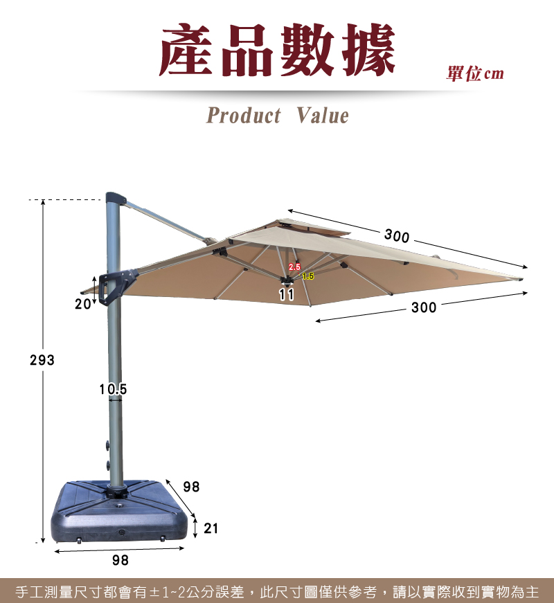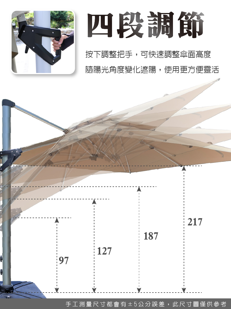 ‣傘與傘座分別距離:97 / 127 / 187 / 217cm(手工測量有±5公分誤差)
