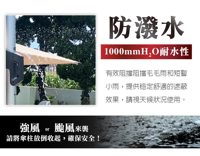 1000mmH2O耐水性,有效阻擋毛毛雨及短暫小雨,提供舒適遮蔽效果。