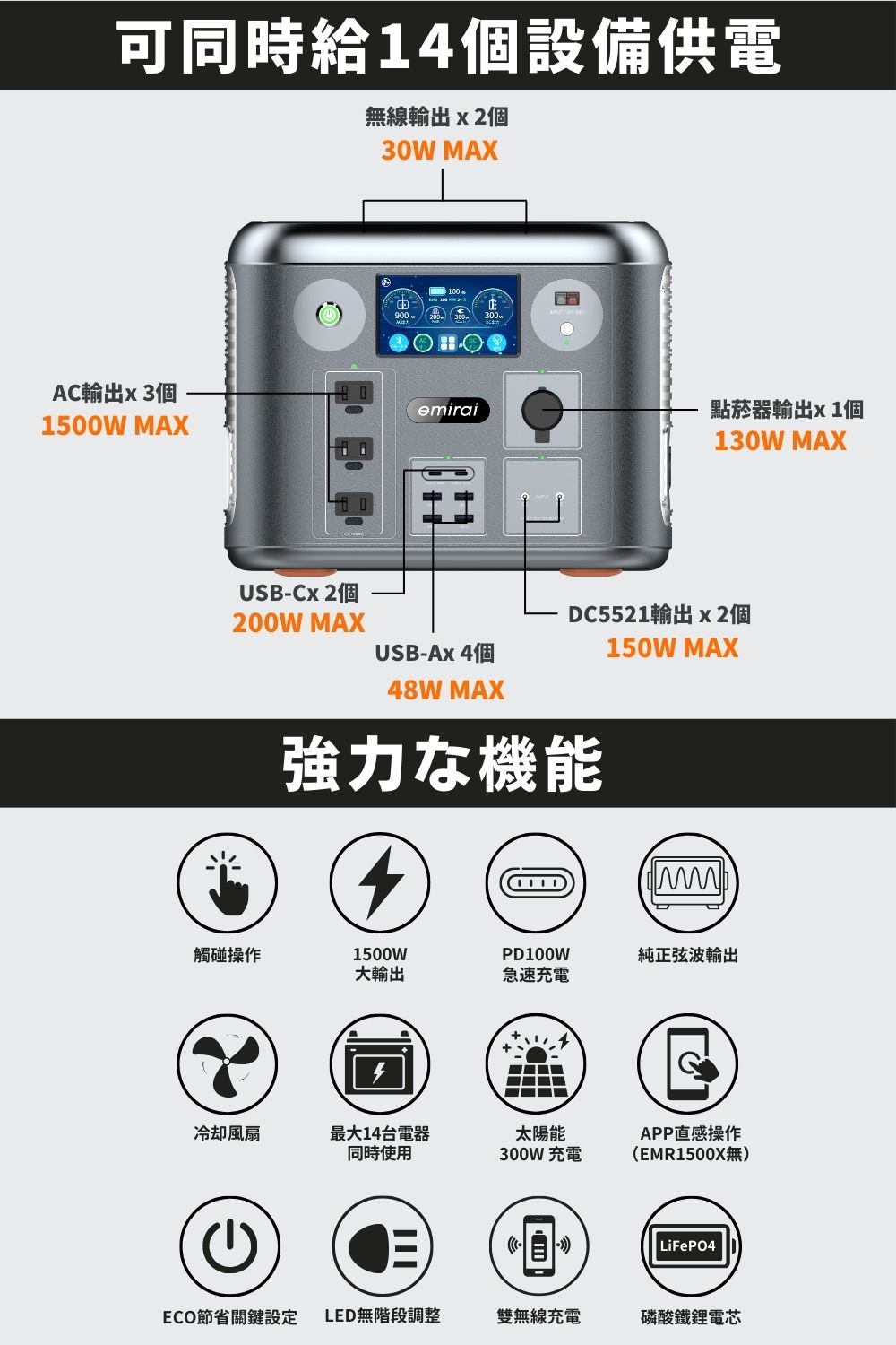 ・ 安全性最高-磷酸鐵鋰電池、純正弦波輸出
