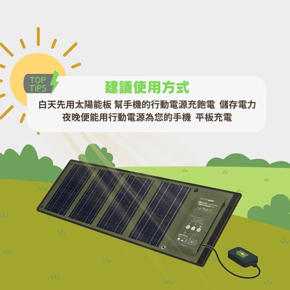 🌞有陽光,就能充電-輕巧折疊,僅iPad大小,方便攜帶與收納。🌞USB+Type-C+DC三種輸出可充手機、行動電源、小型USB 裝置、筆電。🌞附4個登山扣環-可掛在帳篷、背包、陽台,邊走邊充沒問題。🌞防塵防潑水設計(IPX5)-USB輸出藏在拉練收納袋,線材也能收納防護。