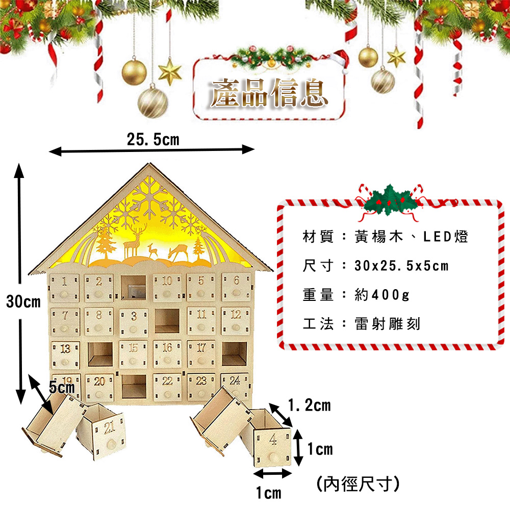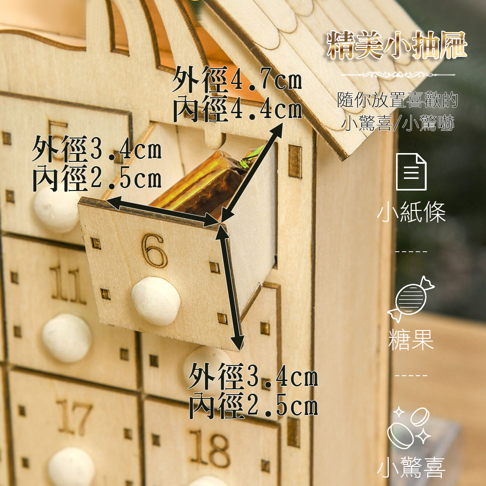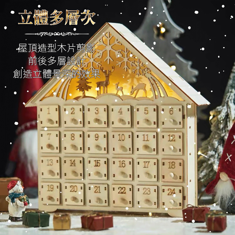 【特別提醒】此為禮物盒,抽屜內『不含』小禮物,需自行準備喔!!🎄✨ 聖誕魔法即將降臨!讓這個精美的木質倒數日曆為您和家人帶來 24 天的驚喜與期待。每天打開一個小抽屜,彷彿解鎖聖誕老人的秘密寶箱 🎅🏼。將糖果 🍬、小玩具 🎁 或暖心小紙條藏入抽屜,為孩子們創造晨間驚喜。夜幕低垂時,點亮頂部的燈光,柔和的光芒映照出麋鹿剪影,為您的家增添一份溫馨聖誕氛圍 🦌。邀請全家一同參與,輪流填滿抽屜,分享節日喜悅。這不僅是倒數日曆,更是凝聚家人情感、傳遞愛與祝福的溫暖媒介。讓聖誕倒數成為您最珍貴的家庭儀式吧! 🥰🎄【產品信息】材質:黃楊木、LED燈尺寸:整體-高30x寬30x厚5cm 抽屜-內徑3.4*3.4*4.4cm 外徑4.4*4.4*5.4cm重量:約370g工法:雷射雕刻