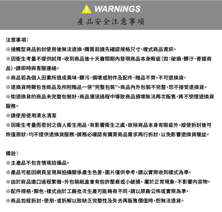 ※商品退換貨必須是「全新狀態」且「完整包裝」,切勿缺漏任何配件和贈品、自行拆解檢查商品、或損毀原廠外盒。