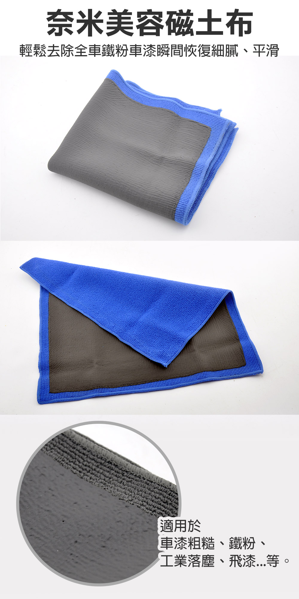 商品介紹奈米專利技術,超越傳統磁土的便利,不傷車漆的前提下強力去除鐵粉、飛漆、鳥糞、粗糙車漆、工業落塵等惱人污漬,使車漆表面瞬間恢復細膩平滑,取代以往使用粗蠟研磨劑或洗車磨泥作業時間長的不便利,提高上蠟後鏡面光澤及潑水性。‧不費力10分鐘完成!省時快速又輕鬆。‧快速清潔頑固汙垢、柏油、工業鐵粉、飛漆等表面汙染。‧奈米專利技術,不傷車漆。‧不必使用任何研磨材料或粗蠟。‧美容蠟及鍍膜劑使用前的前置作業必需品。規格說明‧品名:CLAY-U 可力優 奈米美容磁土布‧尺寸:32 × 30 cm‧顏色:藍色‧成分:奈米聚合膠、超細纖維布‧有效期限:置陰涼處可永久保存‧產地:台灣注意事項‧需使用清水或泡沫清洗。‧使用後以清水洗淨,放置乾燥陰涼處即可。‧嚴禁與石油系清潔劑混合使用(如柏油清潔劑或美容乳蠟)。‧請輕力使用,勿過度施力擦拭表面,容易產生擦痕。‧如已產生擦痕,請上美容細臘即可消除。‧嚴禁長時間至於40度C以上高溫處。‧避免在鈑金處於高溫下施工。‧膠面嚴重汙染髒汙,請立即更換新品,以免刮傷車漆。