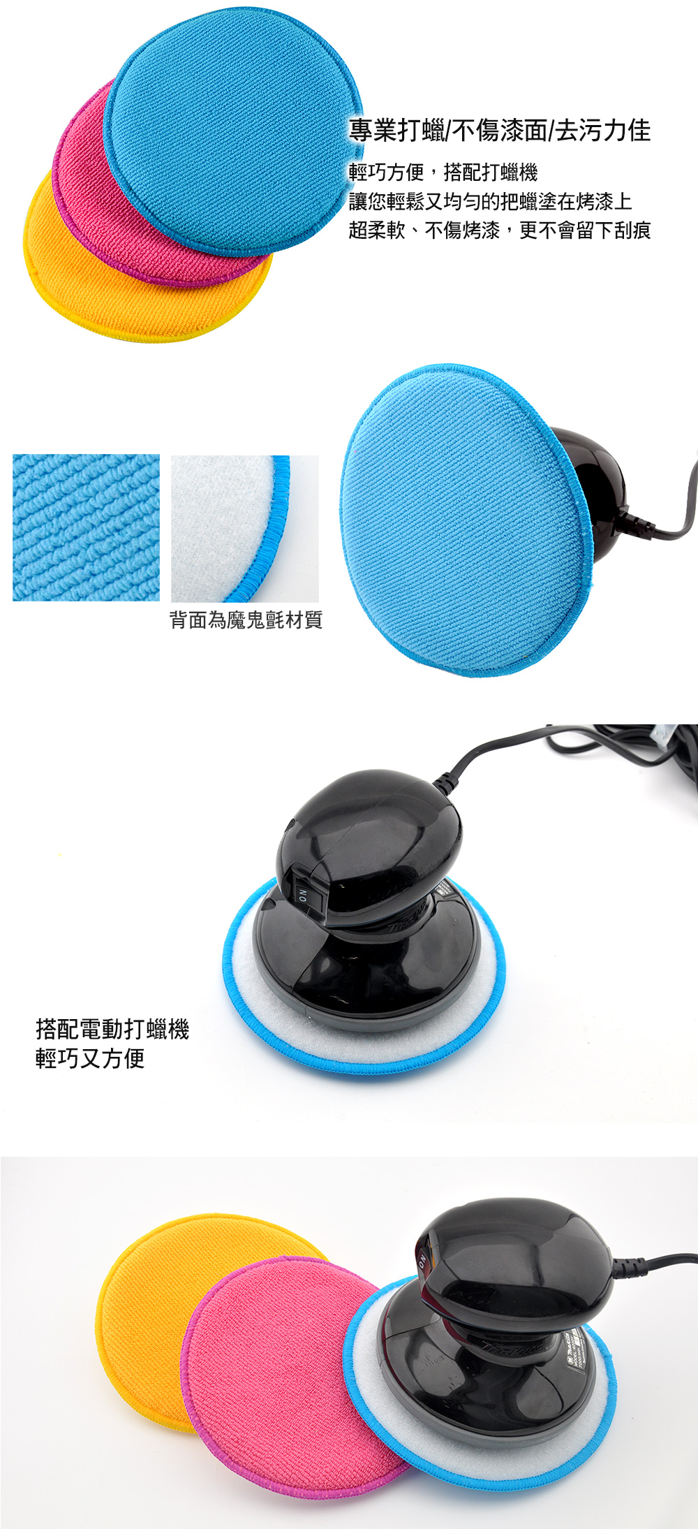 商品介紹‧ 超細纖維拋光布:超強上蠟拋光能力,不掉棉絮、不留水痕、不刮傷,物體表面,耐洗耐搓,壽命長。‧ 適用範圍:汽車、機車、家庭、工業使用方法‧配合氣動打蠟機使用。規格說明‧ 品名:專業級超細纖維拋光棉組‧ 尺寸:6吋(150Φ x 25 mm)‧ 內容物:超細纖維拋光棉(6吋)‧ 數量:3片/1組‧ 產地:台灣注意事項‧ 避免高溫日曬