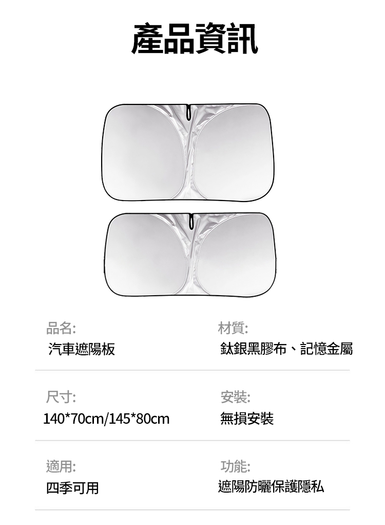 尺寸:140*70cm材質:鈦銀黑膠布、記憶金屬 重量:145g材積:32*35.5*4cm