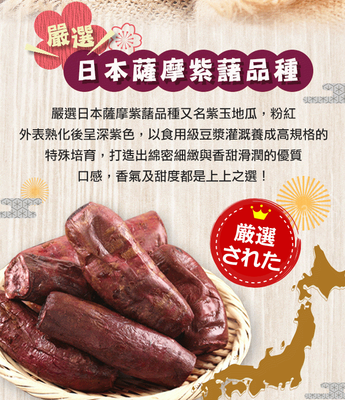 嚴選日本薩摩紫藷品種又名紫玉地瓜,粉紅外表熟化後呈深紫色,以豆漿灌溉養成高規格的特殊培育,打造出綿密細緻與香甜滑潤的優質口感,香氣及甜度都是上上之選!