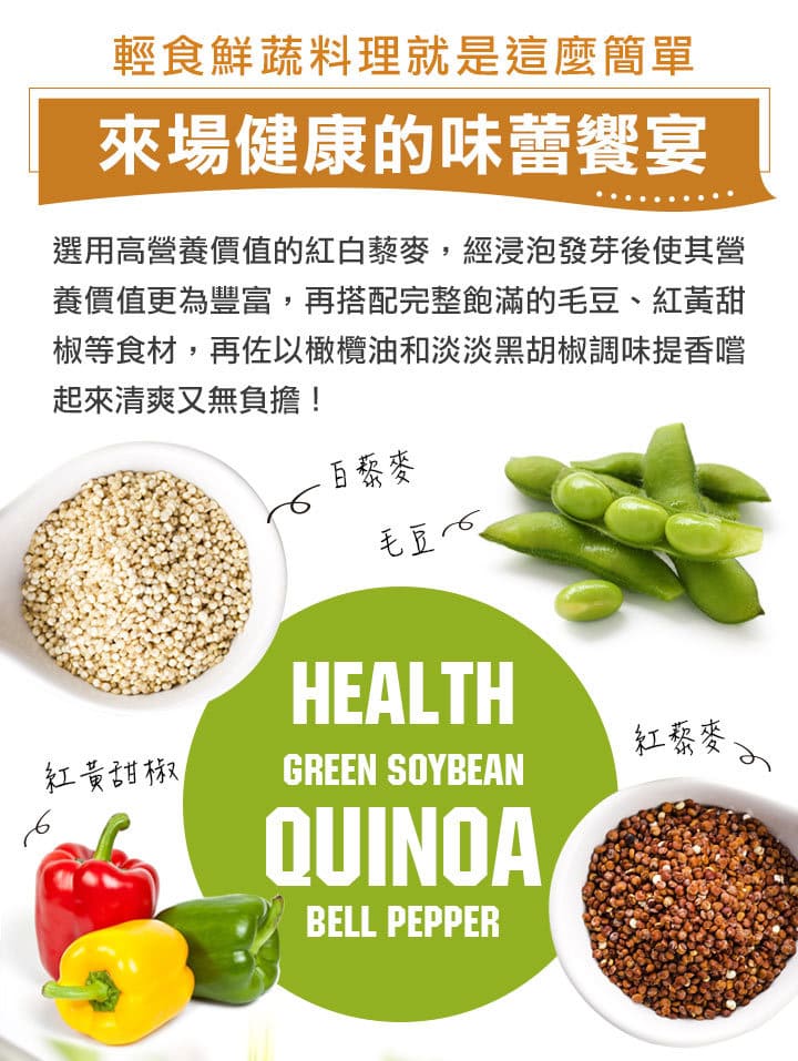 使用高營養價值的紅白藜麥,搭配整顆飽滿的毛豆,配上淡淡的胡椒味提香,即清爽又開胃!