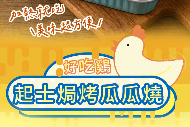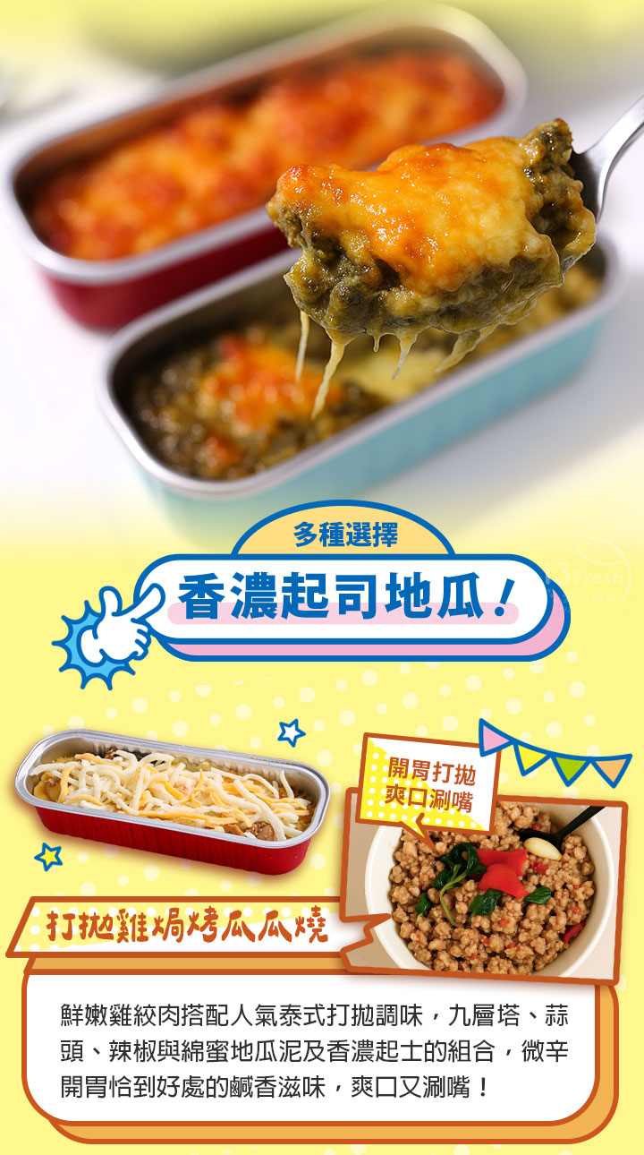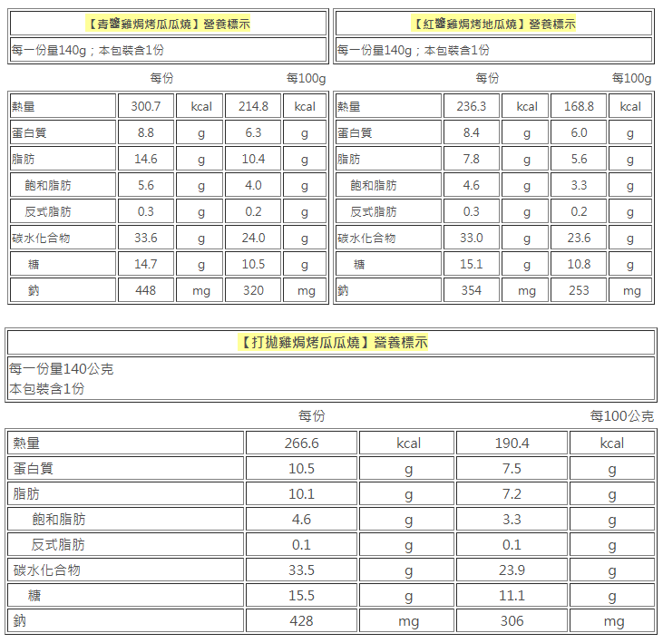 【青醬雞焗烤瓜瓜燒】 成分:地瓜泥、起司(乾酪、棕櫚油、酪蛋白、碘鹽、乳清粉、馬鈴薯澱粉(外灑粉)、奶粉、大豆沙拉油、色素(梔子黃、婀娜多)、黏稠劑(醋酸澱粉、鹿角菜膠)、調味劑(氯化鉀、檸檬酸鈉、檸檬酸)、品質改良劑(磷酸鈉、多磷酸鈉))、雞肉、青醬(碎蒜、水、大豆沙拉油、九層塔、乳酪粉(乾酪(牛乳、鹽、乾酪菌、凝乳酵素)、乳固形物、檸檬酸)、橄欖油、鹽 )、調味醬(九層塔、芥花油、食鹽、大蒜、洋香菜葉、香料(玉米油、香料)、白胡椒)、大豆油、水、蒜粉(麥芽糊精、蒜粉、大蒜香料)、L-麩酸鈉、鹽 過敏源:本產品含有牛奶、羊奶、大豆,不適合對其過敏體質者食用 【紅醬雞焗烤地瓜燒】 成分:成分 地瓜泥、起司(乾酪、棕櫚油、酪蛋白、鹽、乳清粉、馬鈴薯澱粉(外灑粉)、奶粉、大豆沙拉油、色素(梔子黃、婀娜多)、黏稠劑(醋酸澱粉、鹿角菜膠)、調味劑(氯化鉀、檸檬酸鈉、檸檬酸)、品質改良劑(磷酸鈉、多磷酸鈉))、紅醬(切角蕃茄(蕃茄、蕃茄汁、檸檬酸)、洋蔥、蒜頭、番茄醬(水、蕃茄糊、蔗糖、釀造醋、食鹽、香辛料(白胡椒、肉桂、紅辣椒、薑、丁香、肉豆蔻、芥末、月桂葉、眾香子))、砂糖、雞粉(食鹽、麥芽糊精、 L-麩酸鈉、香料、糖、玉米澱粉、雞脂、雞肉萃取物、酵母萃取物、調味劑(5'-次黃嘌呤核苷磷酸二鈉、5'-鳥嘌呤核苷磷酸二鈉)、水、二氧化矽、薑粉、白胡椒粉、焦糖色素、薑黃粉)、鹽、孜然(馬芹子、鹽、乳糖、調味劑(L-麩酸鈉、5'-次黃嘌呤核苷磷酸二鈉、5'-鳥嘌呤核苷磷酸二鈉)、黑胡椒、迷迭香、紅辣椒、洋香菜葉、品質改良劑(二氧化矽、甜味劑(醋磺内酯鉀))、月桂葉粉)、雞肉、碎瓜(黃瓜、醬油(大豆、小麥、鹽)、胺基酸液(水、大豆、鹽)、味素、鹽、檸檬酸、DL-蘋果酸、琥珀酸二鈉、 5’-次黃嘌呤核苷磷酸二鈉、 5’-鳥嘌呤核苷磷酸二鈉、甘草酸鈉(甜味劑)、異抗壞血酸鈉(抗氧化劑)、醋磺內酯鉀(甜味劑)、食用防腐劑(己二烯酸、苯甲酸)、食用色素(黄色4號、黄色5號)) 過敏源:本產品含有大豆、牛奶、羊奶、麩質之穀物,不適合對其過敏體質者食用 【打拋雞焗烤瓜瓜燒】 成分:地瓜泥、調味醬(雞肉、蠔油(蠔汁(蠔、水、鹽)、糖、水、L-麩酸鈉、鹽、羥丙基磷酸二澱粉、小麥粉、焦糖色素)、大豆油、紅辣椒、蒜、九層塔、調味粉(糖、鹽(含碘化鉀)、調味劑(L-麩酸鈉、5'-次黃嘌呤核苷磷酸二鈉、5'-鳥嘌呤核苷磷酸二鈉)、玉米澱粉、複方食品添加物(麥芽糊精、檸檬酸、二氧化矽)、蒜粉、辣椒粉、普通焦糖色素、香料、胡椒粉)、L-麩酸鈉、水、醬油、二砂糖)、起司(乾酪、棕櫚油、酪蛋白、鹽、乳清粉、馬鈴薯澱粉(外灑粉)、奶粉、大豆沙拉油、色素(梔子黃、婀娜多)、黏稠劑(醋酸澱粉、鹿角菜膠)、調味劑(氯化鉀、檸檬酸鈉、檸檬酸)、品質改良劑(磷酸鈉、多磷酸鈉)) 過敏源:本產品含有牛奶、羊奶、螺貝類、麩質之穀物、大豆,不適合對其過敏體質者食用