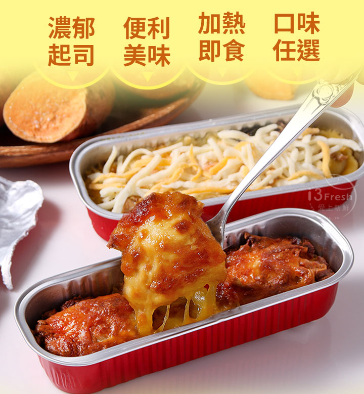 使用台農57號地瓜作為綿密基底,中層鋪上各式醬料~頂層撒上牽絲莫札瑞拉起司,每一口都能吃到多層次口感!