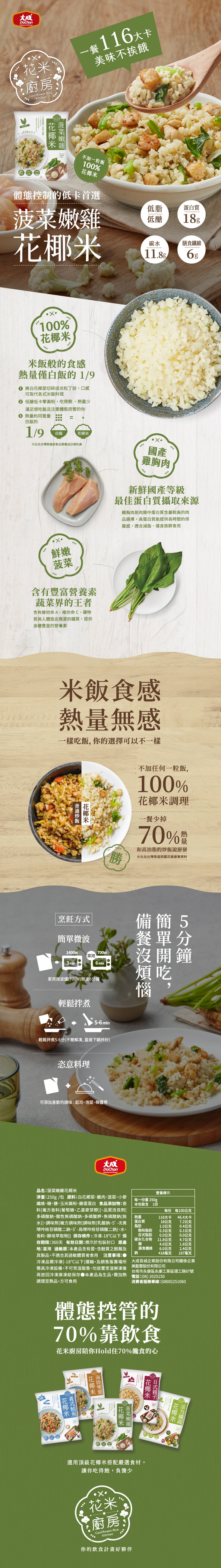 【健身運動首選】 【飲食計畫好夥伴】●使用100%花椰米、嚴選國產雞胸肉●運動健身最佳首選●簡單加熱,5分鐘料理上桌