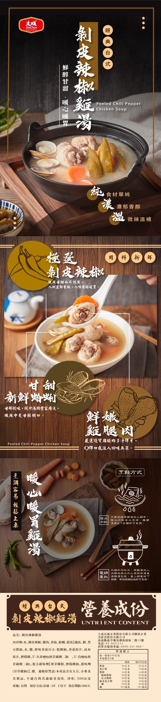 【大成食品】剝皮辣椒雞湯 (500g/包)