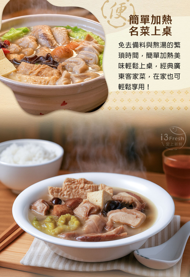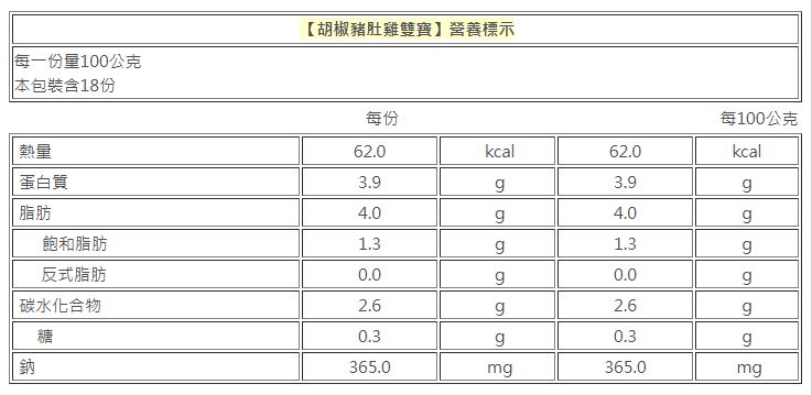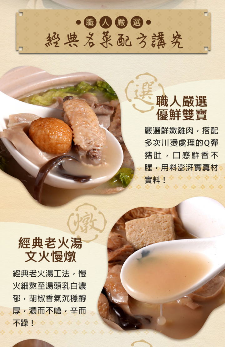 水、大白菜、雞肉、豬肚、豚骨高湯醬【乳化豬汁[豬骨、水、豬油、食鹽、維生素E(抗氧化劑)]、水、醬油、蒜油[大豆沙拉油、豬油、蒜頭、食鹽、維生素E(抗氧化劑)]、大豆沙拉油、豬頭骨濃縮汁[水、豬頭骨、豬皮、維生素E(抗氧化劑)]、食鹽、大豆水解蛋白、砂糖、樹薯澱粉、豬骨泥(豬骨、水)、雞骨濃縮汁[雞骨、水、食鹽、維生素E(抗氧化劑)]、蒜、食用酒精、薑、豆瓣醬[紅辣椒、水、黃豆、食鹽、甘蔗液糖(糖、水)、蠶豆、香油(大豆油、芝麻)、麵粉、調味劑(5'-次黃嘌呤核苷磷酸二鈉、5'-鳥嘌呤核苷磷酸二鈉)、玉米糖膠、八角粉]、昆布抽出物[昆布汁(水、昆布)、糊精、水解蛋白(大豆、玉米)、砂糖、食鹽、調味料(L-麩酸鈉、L-天門冬酸鈉、5'-次黃嘌呤核苷磷酸二鈉、5'-鳥嘌呤核苷磷酸二鈉、琥珀酸二鈉)、三仙膠]、蒜粉[香蒜粉(蒜片、玉米澱粉、麥芽糊精)、玉米澱粉]、白胡椒粉[白胡椒、麩皮粉、麥芽糊精、玉米澱粉、綠辣椒、辣椒、茶枝]、昆布粉(昆布粉、葡萄糖、鹽)、油性辣椒紅(芥花油、紅椒色素);食品添加物:L-麩酸鈉、5'-次黃嘌呤核苷磷酸二鈉、5'-鳥嘌呤核苷磷酸二鈉、玉米糖膠】、排骨酥【豬龍骨切、樹薯澱粉、水、味鮮(L-麩酸鈉、琥珀酸二鈉、食鹽、5'-鳥嘌呤核苷磷酸二鈉、5'-次黃嘌呤核苷磷酸二鈉、胺基乙酸、DL-胺基丙酸)、砂糖、鹽、碳酸氫鈉、木瓜酵素﹝碳酸氫鈉、木瓜酵素(麥芽糊精、木瓜酵素、偏亞硫酸氫鈉)、食鹽﹞、白胡椒粉、五香粉(小茴香、肉桂、陳皮、八角、胡荽子、甘草、丁香、當歸、芹菜籽、川芎、山奈)、香蒜粉(蒜粉、麥芽糊精)】、凍豆腐【水、黃豆(非基因改造)、硫酸鈣】、黑木耳、杏鮑菇、鵪鶉蛋、豆皮【黃豆(基因改造)、大豆油;食品添加物:豆類消泡劑(含脂肪酸山梨醇酐酯、二氧化矽、卵磷脂、完全氫化棕櫚油脂)】、白胡椒粉、紅棗、食鹽、枸杞