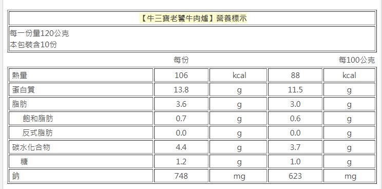 成分:水、牛肉塊(巴拉圭)、牛肚(巴拉圭)、牛筋(巴拉圭)、醬油[(水、脫脂大豆(非基因改造)、小麥、鹽、轉化液糖(蔗糖、水)、酒精、調味劑(琥珀酸二鈉、5'-次黃嘌呤核苷磷酸二鈉、5'-鳥嘌呤核苷磷酸二鈉)、甜味劑(甘草素)]、辣豆瓣[(辣椒、水、非基因改造黃豆、黏稠劑(乙醯化己二酸二澱粉)、麻油、調味劑(L-麩酸鈉、5’-次黃嘌呤核苷磷酸二鈉、5’-鳥嘌呤核苷磷酸二鈉)、糖、黏稠劑(玉米糖膠)、乳酸)]、蔥、洋蔥、牛番茄、蕃茄糊、番茄醬(水、番茄糊、高果糖糖漿、鹽、醋)、老薑、鹽、米酒、牛晶粉[(鹽、L-麩酸鈉、糖、香料、麥芽糊精、玉米澱粉、牛油、水解玉米蛋白(水解玉米蛋白、麥芽糊精、鹽、葵花籽油)、牛肉風味調味料[牛肉萃取物(鹽、牛肉、麥芽糊精)、鹽、L-麩酸鈉、牛油、焦糖色素、5'-次黃嘌呤核苷磷酸二鈉、5'-鳥嘌呤核苷磷酸二鈉]、牛肉萃取物[牛肉萃取物、牛骨高湯(牛骨、鹽)、鹽、分離大豆蛋白、大豆卵磷脂]、洋蔥粉、焦糖色素、調味劑 (5’-次黃嘌呤核苷磷酸二鈉、5’-鳥嘌呤核苷磷酸二鈉)、二氧化矽、大蒜粉、檸檬酸、黑胡椒粉)]、糖、老抽(水、大豆、糖、鹽、小麥粉)、蒜、滷包(八角、小茴香、花椒、肉桂、豆蔻、乾薑)、八角、己二烯酸鉀(防腐劑)、雞粉(鹽、麥芽糊精、蔗糖、雞肉粉、雞油、酵母抽出物、胺基乙酸、DL-胺基丙酸、5' -次黃嘌呤核苷磷酸二鈉、5' -鳥嘌呤核苷磷酸二鈉、醬油粉、琥珀酸二鈉)