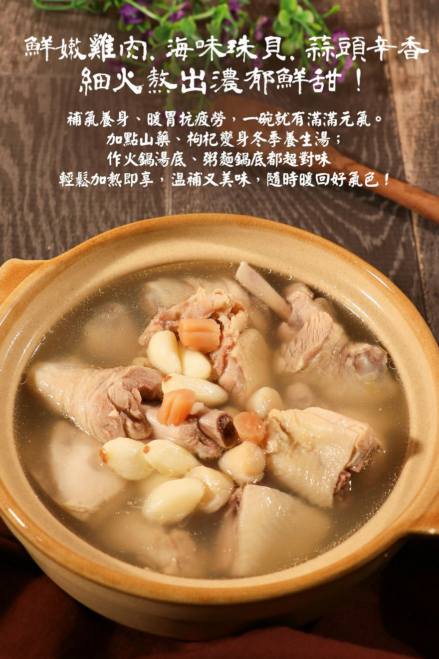 海味珠貝 × 蒜香濃湯,暖胃補氣、鮮香入心!嚴選鮮嫩雞肉,搭配富含海洋精華的珠貝與香氣濃郁的蒜頭,經長時間細火燉煮,湯頭濃醇鮮甜、層次豐富。珠貝滋陰養氣、蒜頭暖胃提香,結合雞肉的鮮美與營養,打造出一碗兼具補氣潤膚、溫潤不膩的元氣湯品。無論日常調養或居家溫補,一包即享滿滿暖心滋味。珠貝蒜頭雞湯結合珠貝、蒜頭與雞肉三大營養精華,具有增強免疫力、暖胃、恢復體力。特別適合換季調養、疲勞時補氣養身,一碗暖湯即刻喚醒活力。✦ 冬季養生湯飲:加入山藥、枸杞,風味溫潤、滋補加倍。✦ 養生火鍋湯底:搭配時令蔬菜、菇類同煮,湯頭鮮美不油膩。✦ 粥麵鍋底:放入白米或米線,完整吸收湯中精華,飽足又營養。一包即享,簡單加熱,輕鬆品味家的溫度與健康的力量。暖心個人湯飲,享受美味超便利上班族 / 小家庭 - 給生活忙碌的你,下班後快速上桌的餐點。即熱即食、省時方便,同時又能享受鮮美濃郁的美味雞湯。注重養生族群- 給重視食材來源與健康飲食的你,不喜歡人工添加物。使用優質食材製作的美味湯,無添加、真材實料、適合四季湯水滋養。年長族群 / 照顧長輩的孝心湯飲 - 對於牙口不佳的銀髮族群,隨時一碗湯頭香氣滿滿、入口清爽、不油膩,雞肉軟嫩鮮香。學生 / 外宿族 - 生活壓力大又常吃外食,缺少營養均衡,讓身體發出抗議啦。不須開火、不須過度烹調,只需退冰+復熱就能享用美味一餐,快速補充蛋白質與滋養湯品。冬令暖胃/團聚 - 年節、冬令進補時,家庭或朋友聚會時,方便準備的大眾化湯品,巧手變化成美味湯底,添加其他時令蔬果,澎派好料在一鍋,既有儀式感又省時。調理方式:「直火烹調」倒入鍋中,放置瓦斯爐以直火方式加熱至全滾。「蒸煮」倒入耐熱容器中,隔水加熱15-20分鐘至中心點熟透即可。「微波」倒入耐熱容器中,微波加熱15-20分鐘至中心點熟透即可。