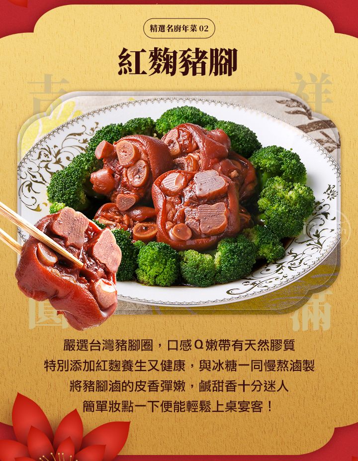 商品成分:豬腳圈(台灣)、水、醬油(大豆、小麥、食鹽、砂糖、調味劑(L-麩酸鈉、胺基乙酸)、著色劑(焦糖色素)、甜味劑(甘草酸鈉))、米酒(水、米、精製食用酒精)、醬油膏(釀造醬油(水、脫脂大豆片、小麥)、水、蔗糖、鹽、乙醯化己二酸二澱粉、糯米、調味劑(琥珀酸二鈉、胺基乙酸、DL-胺基丙酸、5'-次黃嘌呤核苷磷酸二鈉、5'-鳥嘌呤核苷磷酸二鈉)、著色劑(焦糖色素)、品質改良劑(無水碳酸鈉)、酵母粉、甜味劑(甘草酸鈉))、紅蔥頭、蒜頭、蔥、薑、冰糖、紅麴米(紅麴菌、米)、鹽