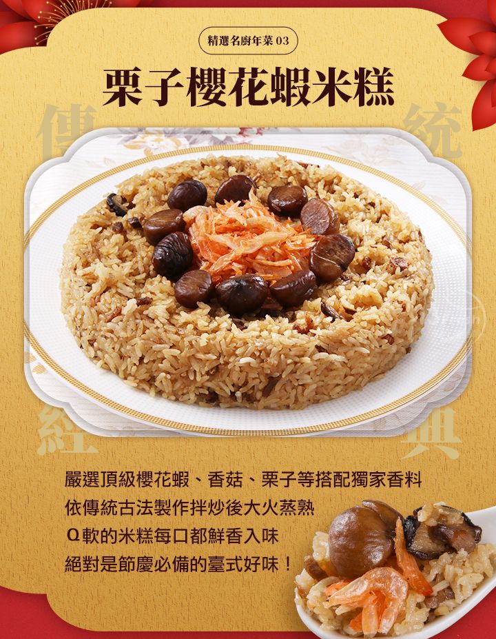 商品成分:糯米、栗子、櫻花蝦、油蔥酥(豬油(台灣)、紅蔥頭)、香菇絲、蝦仁、扁魚、水、米酒(米、蔗糖、純水)、大豆沙拉油、砂糖、地瓜粉、芝麻油、樹薯澱粉、食鹽、雞粉〔食鹽、麥芽糊精、L-麩酸鈉、蔗糖、玉米澱粉、雞肉粉(雞肉、迷迭香萃取物)、香料、酵母粉、雞油(雞油、迷迭香萃取物)〕、棕櫚油、白胡椒、L-麩酸鈉、黑胡椒、肉桂粉、五香粉(肉桂、八角、丁香、小茴香、山奈、花椒、甘松)