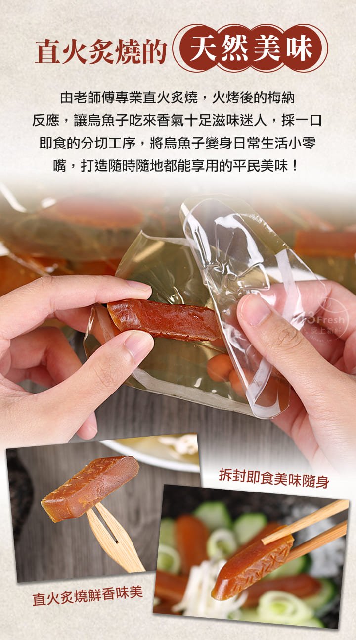 老師傅專業直火炙燒火烤後的梅納反應,讓烏魚子吃來香氣十足滋味迷人,一口即食的分切,將烏魚子變身日常生活小零嘴,打造隨時隨地都能享用的平民美味!