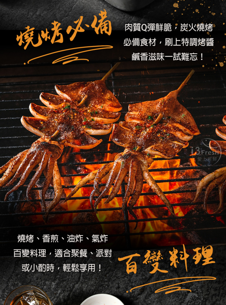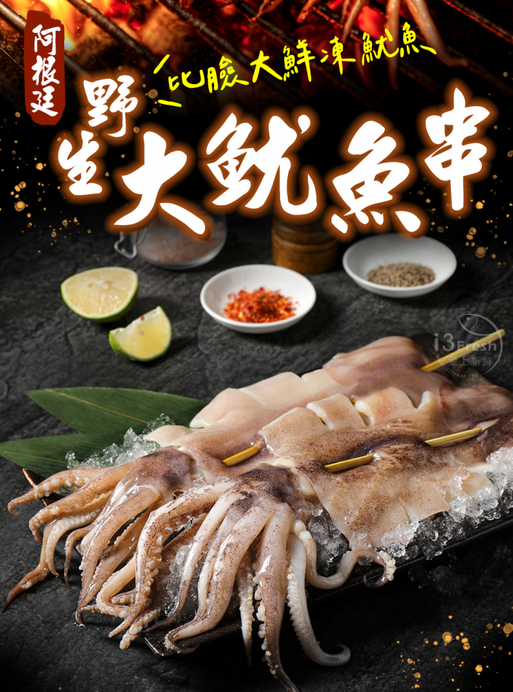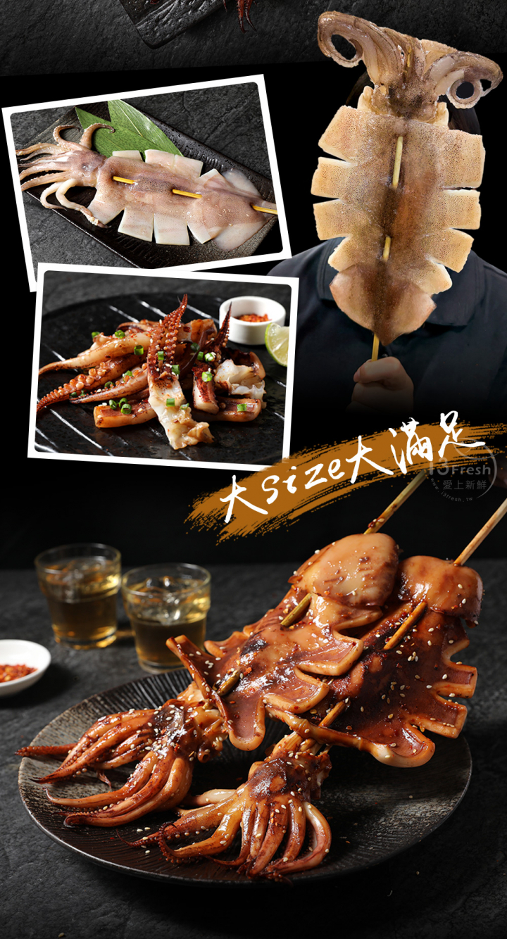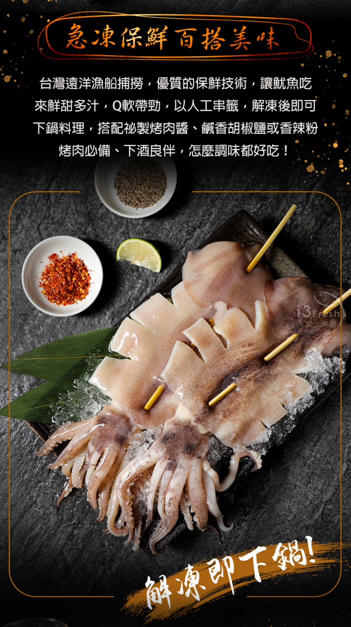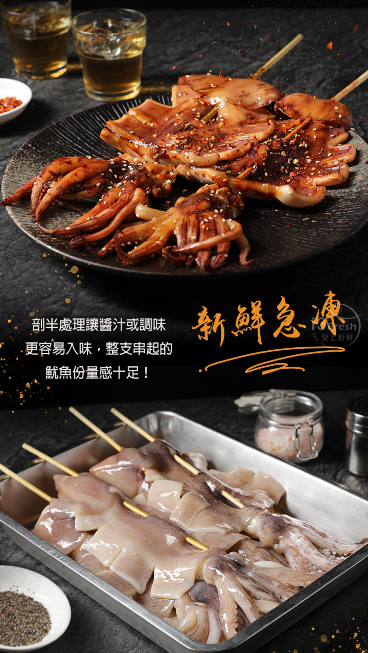 台灣遠洋漁船捕撈,優質的保鮮技術,讓魷魚吃起來鮮甜多汁,Q軟帶勁,以人工串籤,解凍後即可下鍋料理,搭配秘製烤肉醬、鹹香胡椒鹽或香辣粉,烤肉必備、下酒良伴,怎麼調味都好吃!