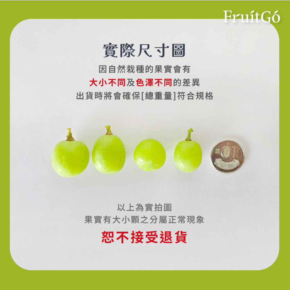 小提醒:❶ 天然栽種之新鮮水果蔬菜會有些許大小顆差異,馥果出貨時會確保總重量符合商品規格。❷ 葡萄會有運輸時產生的輕微痕跡 ( 如:落果等),並不影響實際口感喔!❸ 進口原箱商品為不拆售直接出貨,運送過程約有5%的耗損為正常現象,恕不在退換貨範圍。❹ 外箱為示意圖,出貨品牌及外箱包裝以當次到貨為準。