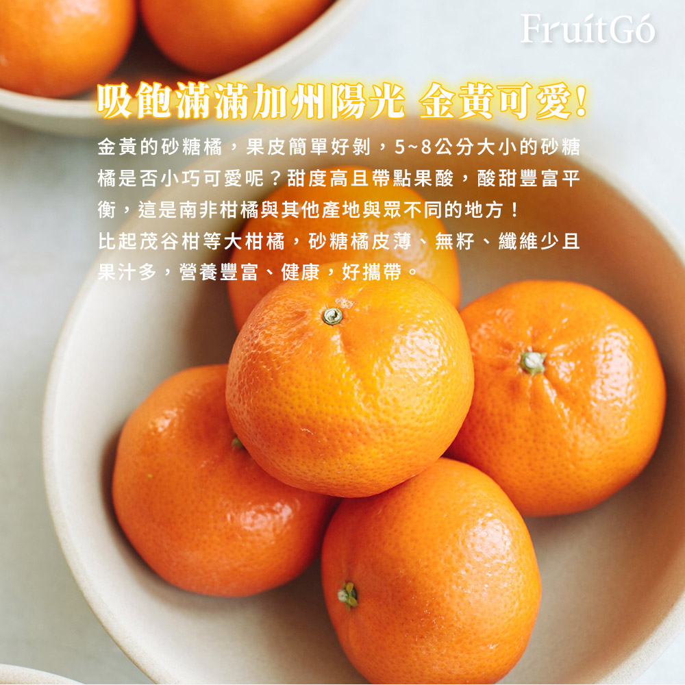 美國當地最近非常流行的...加州砂糖橘說到橙類,大家一定馬上想到陽光普照的美國加州!馥果精選美國加州品質最好的砂糖橘比起茂谷柑等其他大柑橘,砂糖橘的白色纖維較少,且較多汁!◎ 皮薄、易剝 Easy-To-Peel◎ 甜、無籽◎ 纖維細、多汁吸飽滿滿加州陽光,金黃可愛可愛的金黃小巧果型,加上皮薄、易剝,很多小朋友都喜歡自己動手剝,有趣、好吃又營養!大朋友一吃就是3-5個,涮嘴的停不下來!☀️ 保存|建議冷藏。冷藏保存約3週,常溫約1週左右。馥果秉持新鮮出貨,收到後可以多放幾天退酸,甜度更好唷!鮮果類建議提早享用風味較佳!小提醒:❶ 天然栽種之新鮮水果蔬菜會有些許大小顆差異,馥果出貨時會確保總重量符合商品規格。❷ 橙子皆是自然生長,由農民一顆顆手採,再經由長途運輸後抵達台灣;表皮會有採收、運輸時產生的輕微痕跡 ( 如:枝傷、碰撞等),並不影響實際口感喔!❸ 進口原箱商品為不拆售直接出貨,運送過程約有5%的耗損為正常現象,恕不在退換貨範圍。