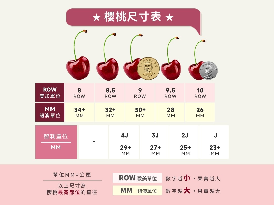 — White Cherry —獨特的色澤,嬌嫩欲滴,口感清甜!產地|智利 <十一~隔年三月>規格|特大—32~34mm,SP,4J 大顆—30~32mm,P,3J 中大—28~30mm,SJ/2J/XJ