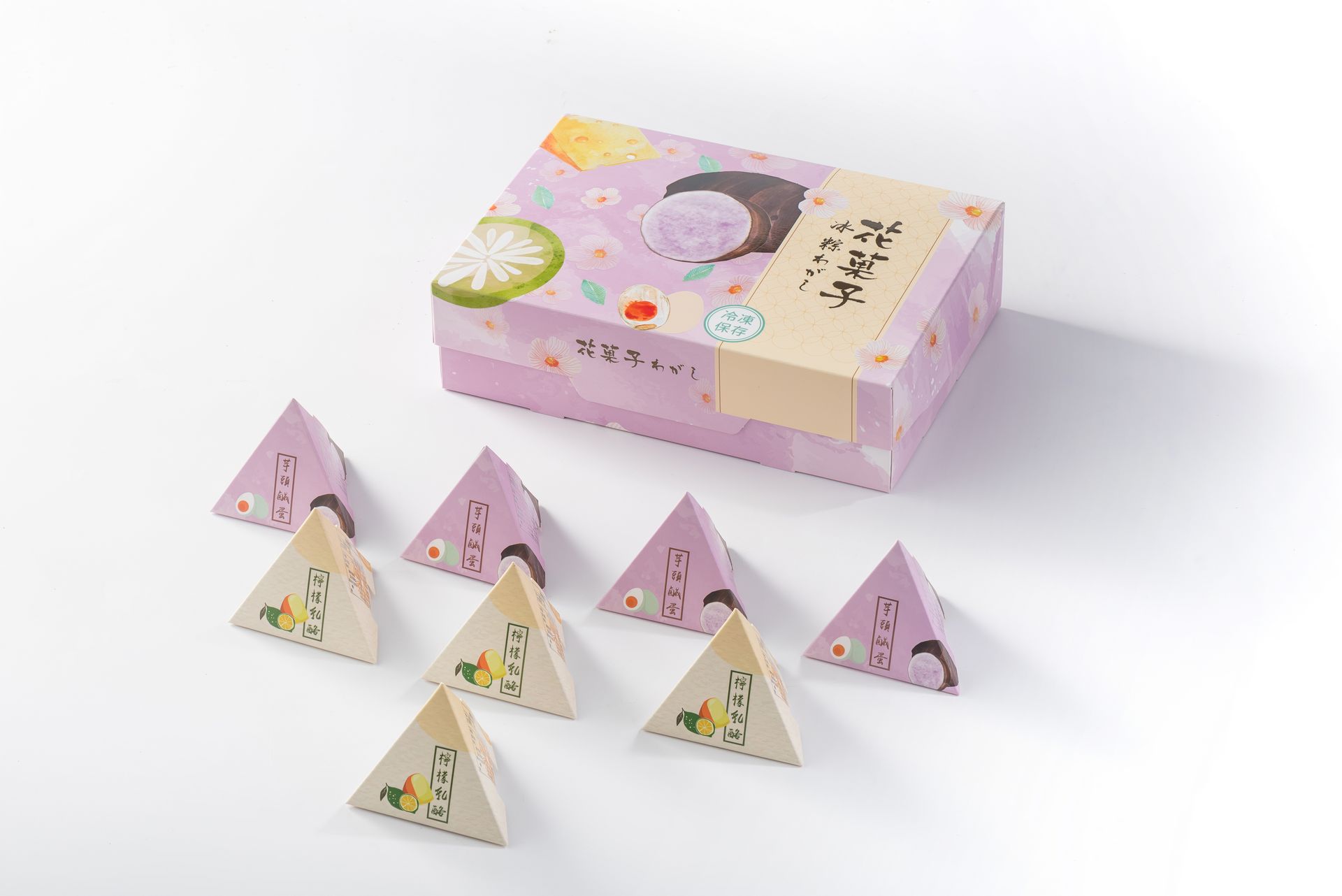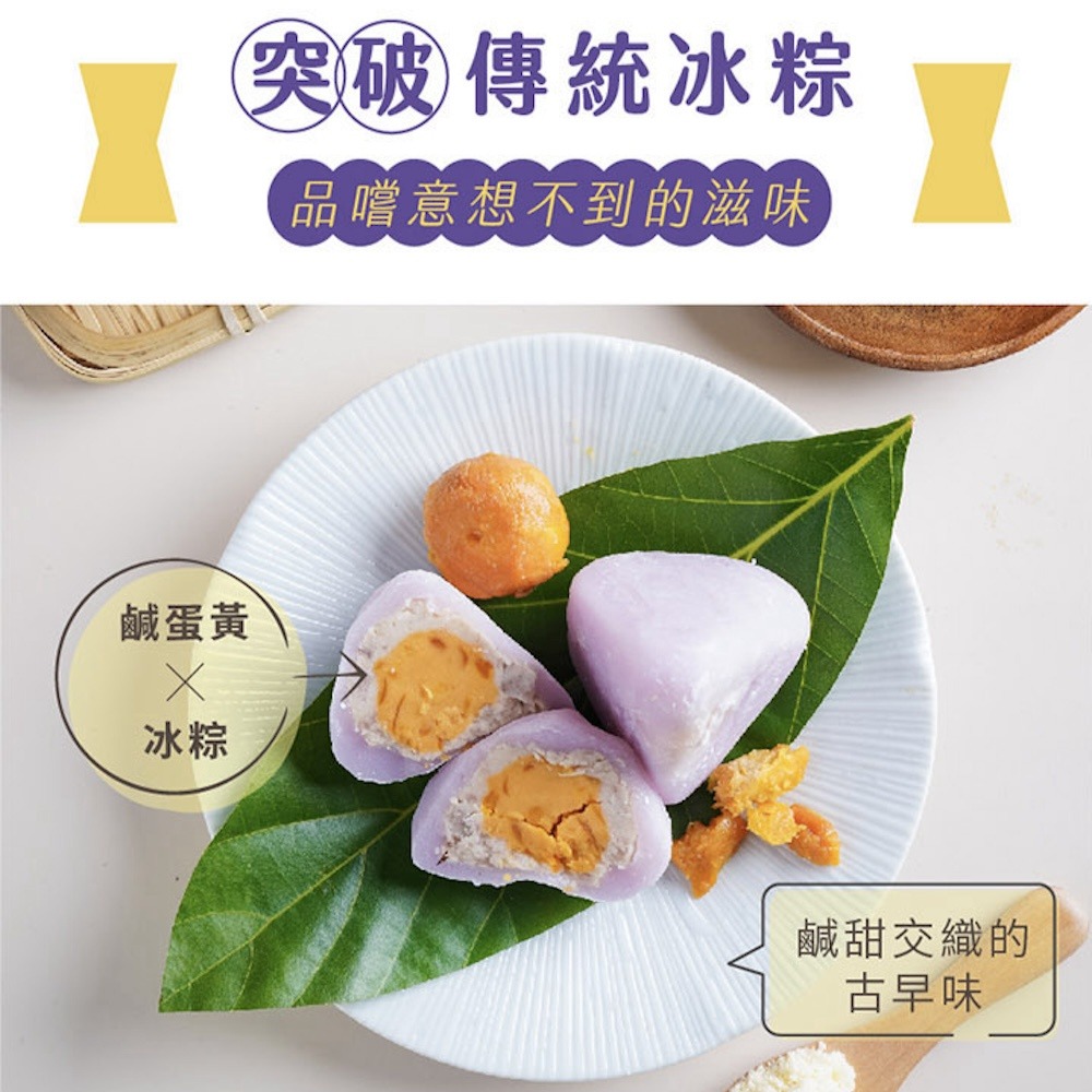 【花菓子冰粽芋頭鹹蛋】黃金紫薯芋泥(麻糬和菓子) 【芋頭鹹蛋】源自日本做麻糬和菓子的技術,外皮添加葛粉,內餡食材超用心、高成本製作高質量產品! 外皮使用在地紫色番薯與麻糬相結合,呈現出夢幻的紫羅蘭色,滿足視覺饗受! 內餡是源至總鋪師古早味手路菜,〝酥炸芋頭鹹蛋黃〞的元素,最內層的鹹蛋黃與雙起士相結合,中間夾餡使用甲仙芋頭泥,經過繁雜的工序,不只質地鬆軟更能吃到芋頭的顆粒,口感多層次!過敏原:本產品含有奶類、蛋及其製品,不適合其過敏體質者食用。重量:60公克±5%/顆,8顆/盒。保存期限:冷凍零下18 ℃以下,未拆封八個月。有效日期:(標示於包裝上)原產地:台灣。