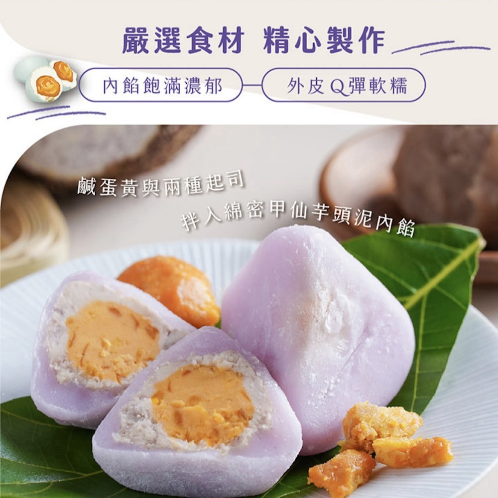 外皮使用在地紫色番薯與麻糬相結 內餡保有酥炸芋頭鹹蛋黃的口感 能吃到芋頭的顆粒,口感多層次! 源自日本做麻糬和菓子的技術