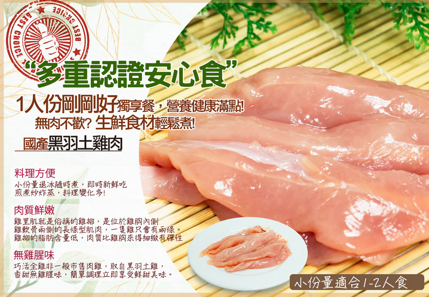 來自雲林純淨牧場的頂級黑鑽雞採低密度自然放養、雞隻堅持自然熟成細緻的肌肉纖維,渾然天成的彈牙口感多項藥物殘留檢驗合格擁有專業品質認證的安心食材來自雲林純淨牧場的頂級黑鑽雞,採無污染低密度高保濕的飼養環境培育。肉質結實有彈性,少了一般肉雞的腥味,脂肪與含水量少,蛋白質更多、營養價值更高。皮薄彈牙、雞汁甘甜飽滿、肉質細緻口感佳。以低密度放養,自然熟齡育成,口感最佳,通過SGS國際級檢驗合格,以專業的急速冷凍技術封存包裝,確保營養及原始風味不流失。