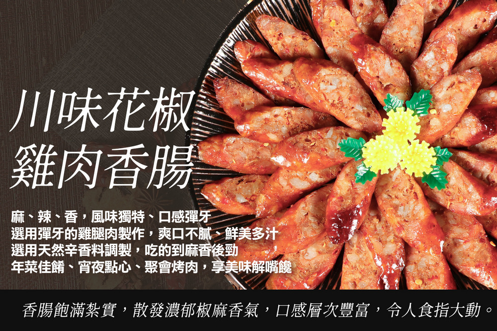 正宗川味,香而不辣☆麻、辣、香,風味獨特、口感彈牙☆選用雞肉製作,爽口不膩、鮮美多汁☆選用天然辛香料調製,吃的到麻香後勁☆年菜佳餚、宵夜點心、聚會烤肉,享美味解嘴饞! 選用國產優質雞腿肉,搭配豬背脂及天然豬腸衣製作而成。獨家配方搭配花椒、辣椒、黑胡椒及各式中式辛香料調製。雞肉柔軟細緻、清爽且不油不膩,一口咬下肉汁滿溢。香腸飽滿紮實,散發濃郁椒麻香氣,口感層次豐富,令人食指大動。適合各式烹調,煎煮燒烤炸,快速上桌輕鬆品嚐美味。 特別選用肉質彈牙且雞汁飽滿的雞腿肉,搭配獨家的椒麻配方(花椒、辣椒、黑胡椒、蒜、八角、小茴…等),作出椒香濃郁、鮮嫩多汁、清爽不油膩雞肉香腸。煎烤後的香腸散發特殊的香氣,一口咬下香甜又微辣肉汁充斥在嘴中,辛香濃郁、滋味獨特,絕對讓你口腹滿足、讚不絕口!【平底鍋】倒入少許油熱鍋,以中小火慢煎至全熟。【氣炸鍋】放入氣炸鍋中,以180度烘烤15-20分鐘,翻面再烤3分鐘。【炭火燒烤】放在烤網上,持續翻面烤至腸衣酥脆、肉汁溢出。