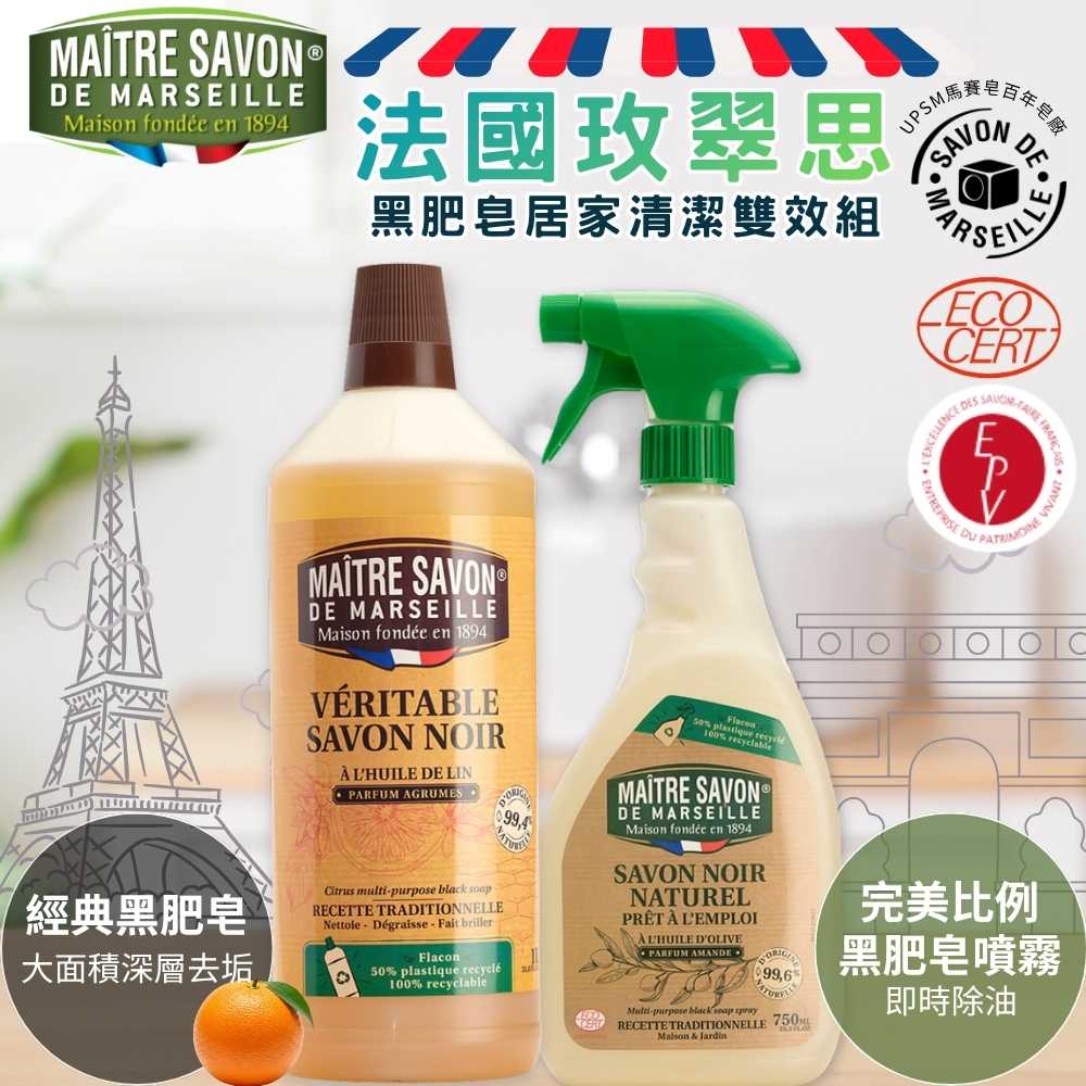 ✔️✔️組合優惠【本野有限公司】法國玫翠思亞麻油黑肥皂1L(柑橘) + 法國玫翠思黑肥皂強效家用去汙噴霧 750ML