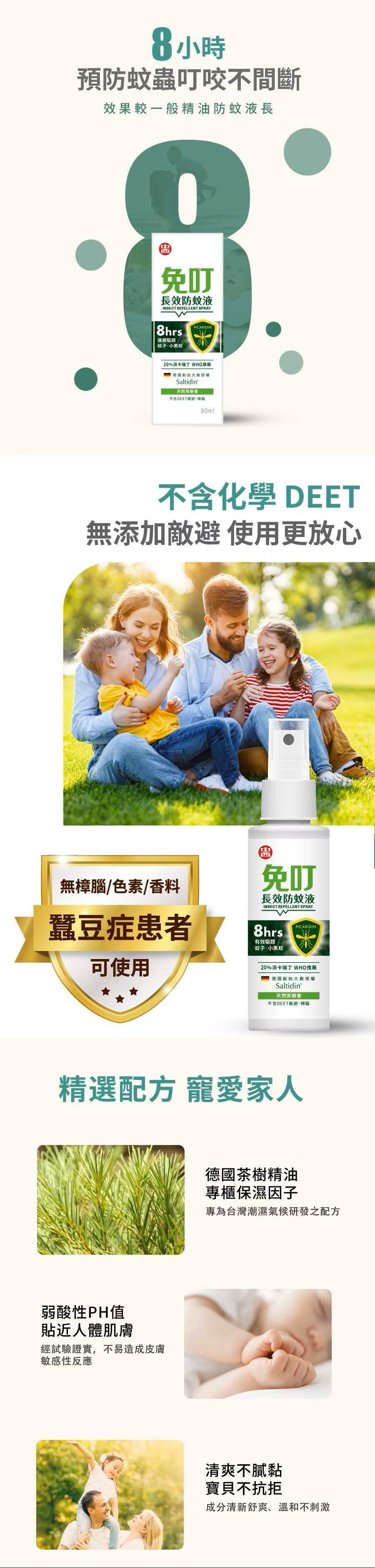 .派卡瑞丁是獲得世界衛生組織與歐盟推薦,可噴灑在皮膚上並有效防蚊的成分之一。.本產品使用Saltidin®德國創始大廠授權進口的派卡瑞丁成分,品質有保證。.舒爽不黏膩,茶樹香氛氣味芬芳不刺鼻,擺脫他牌產品黏膩又刺鼻的不佳防蚊體驗。.經第三方試驗證實可連續8小時有效防止蚊子、小黑蚊類叮咬。(天氣炎熱易流汗的部位要適時補噴抹來維持效力).不含敵避 (DEET)、樟腦,孕婦與幼童、蠶豆症患者都適用。.臺灣製造、品質安心。