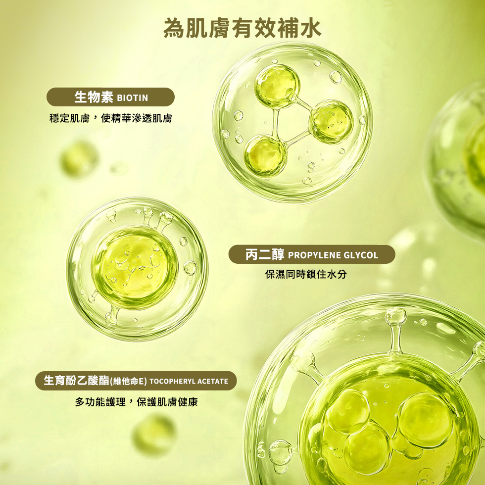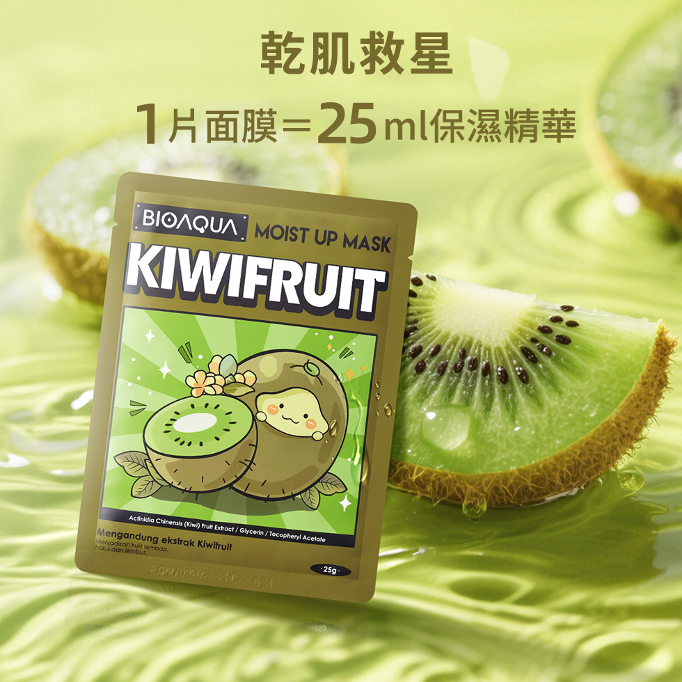 含奇異果萃取、維他命E、生物素,潤澤肌膚同時鎖住水分,讓肌膚光滑、柔軟,適合乾燥肌膚。親膚透氣面膜布,360°貼合臉部肌膚,幫助精華滲透肌底。